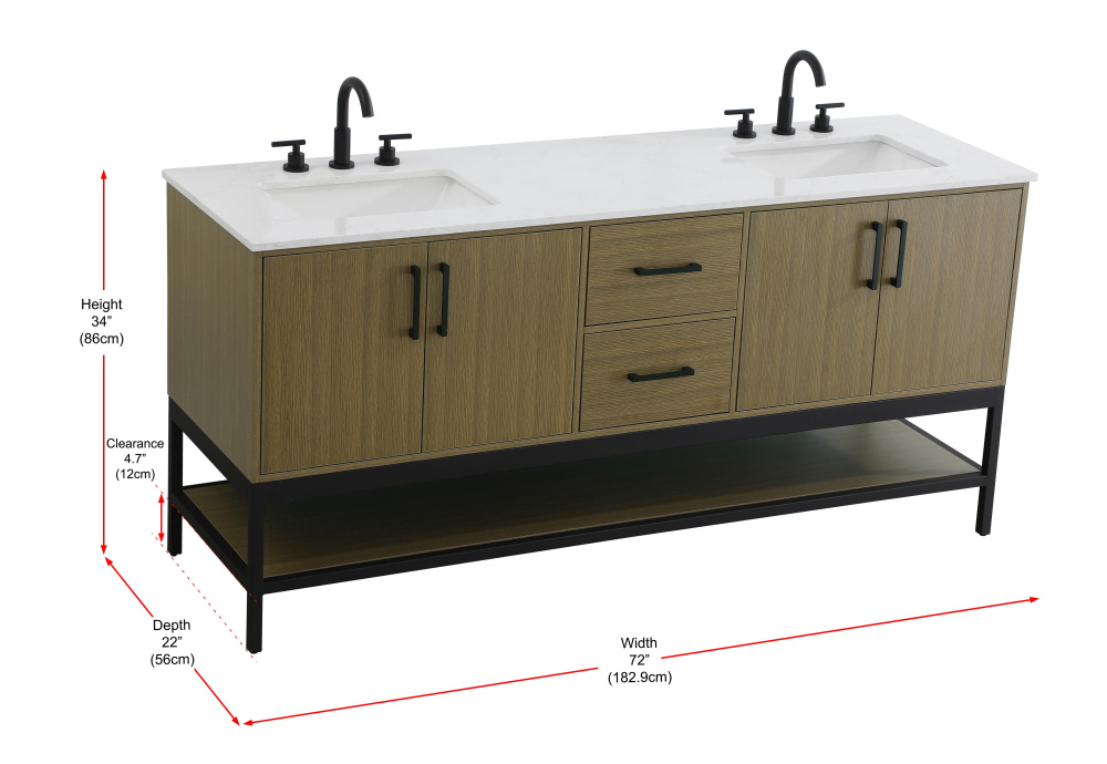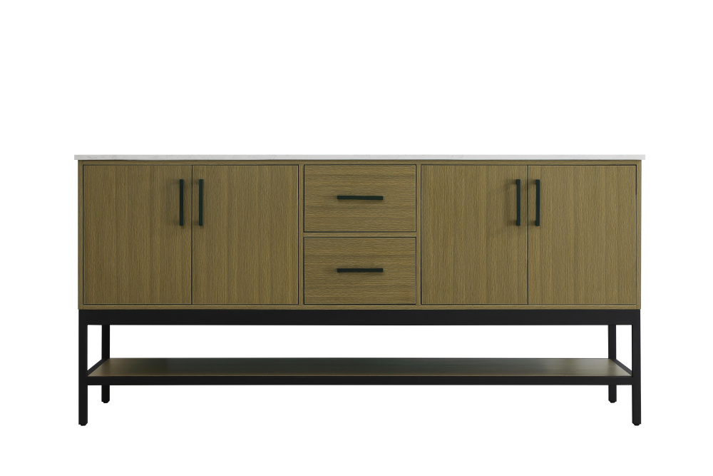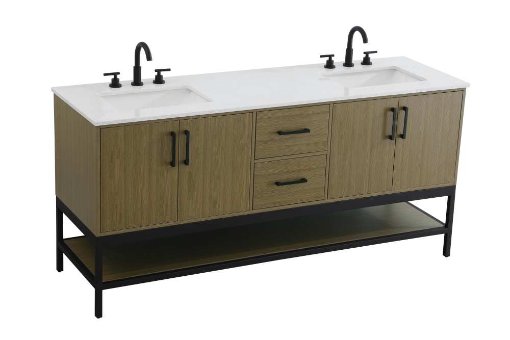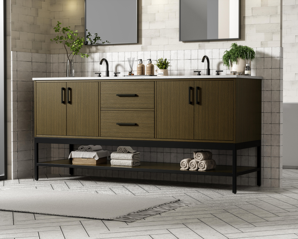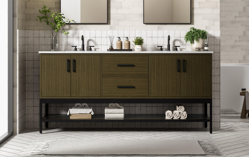 Upgrade your bathroom with this modern bathroom vanity that combines form and function effortlessly. Its sleek wood veneer cabinetry, paired with a bold black metal frame, brings a clean, contemporary vibe to any space. Designed with practicality in mind, this vanity offers soft-close drawers and cabinets to organize your essentials, as well as an open lower shelf for added storage or display. The durable white quartz countertop is built to withstand daily use, while the undermount ceramic sink ensures easy maintenance. Complete with matte black hardware and pre-drilled features for effortless installation, this vanity is the perfect centerpiece to refresh your bathroom with style and efficiency.