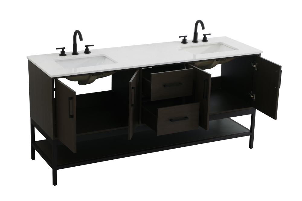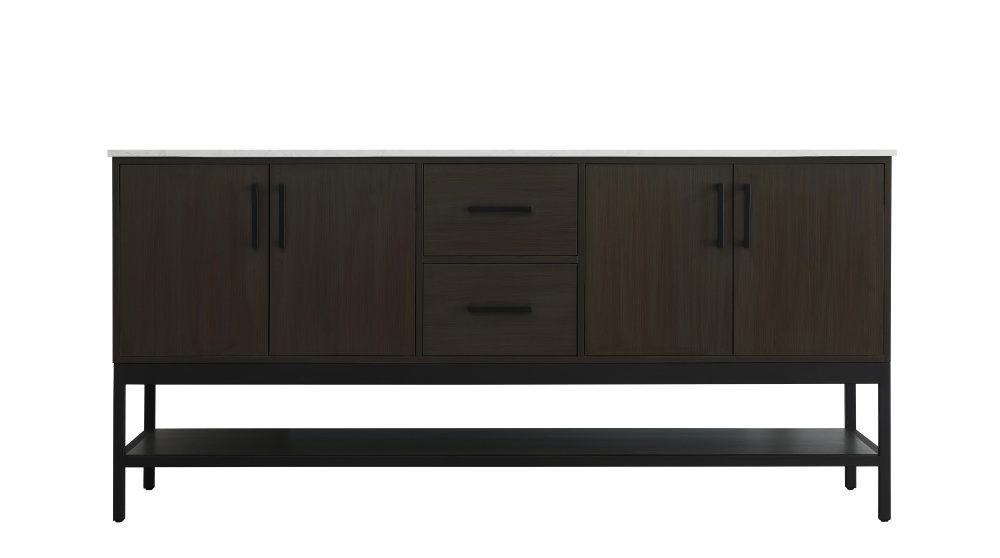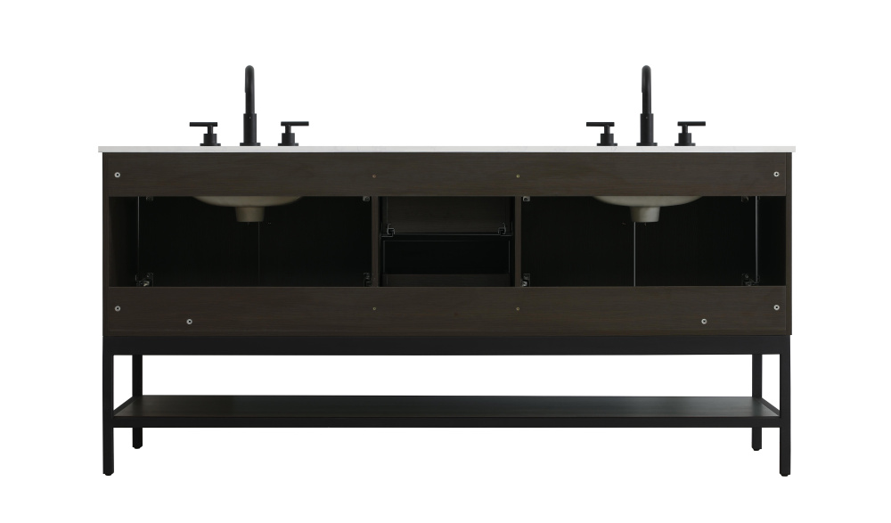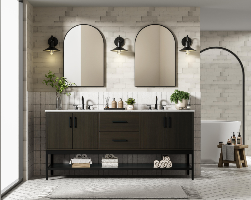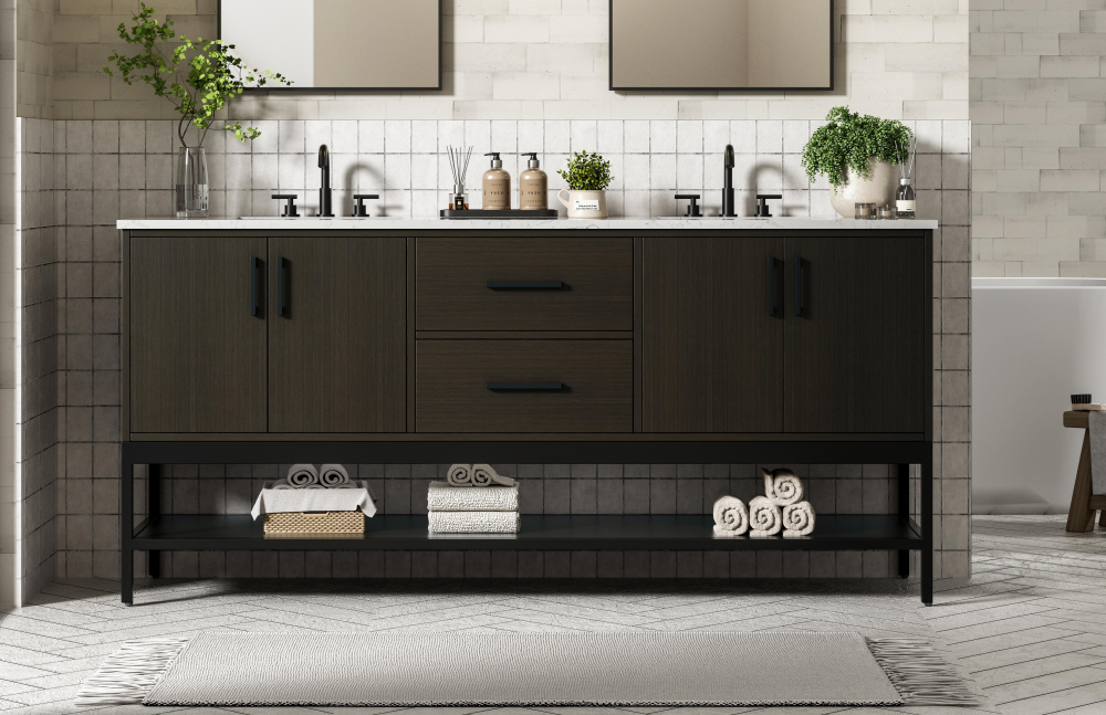 Upgrade your bathroom with this modern bathroom vanity that combines form and function effortlessly. Its sleek wood veneer cabinetry, paired with a bold black metal frame, brings a clean, contemporary vibe to any space. Designed with practicality in mind, this vanity offers soft-close drawers and cabinets to organize your essentials, as well as an open lower shelf for added storage or display. The durable white quartz countertop is built to withstand daily use, while the undermount ceramic sink ensures easy maintenance. Complete with matte black hardware and pre-drilled features for effortless installation, this vanity is the perfect centerpiece to refresh your bathroom with style and efficiency.
