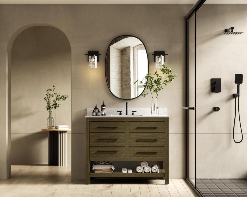 A luxurious engineered marble countertop with beautiful veining brings timeless elegance to any bathroom.