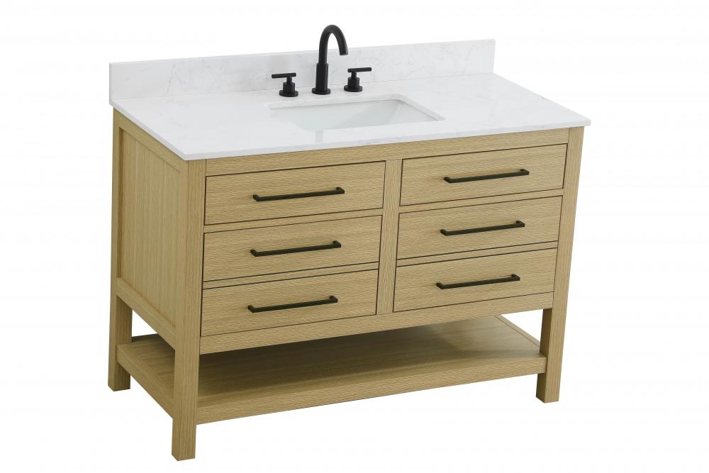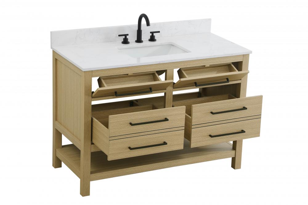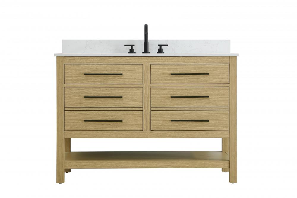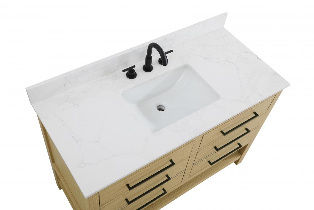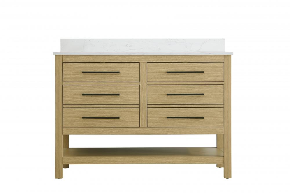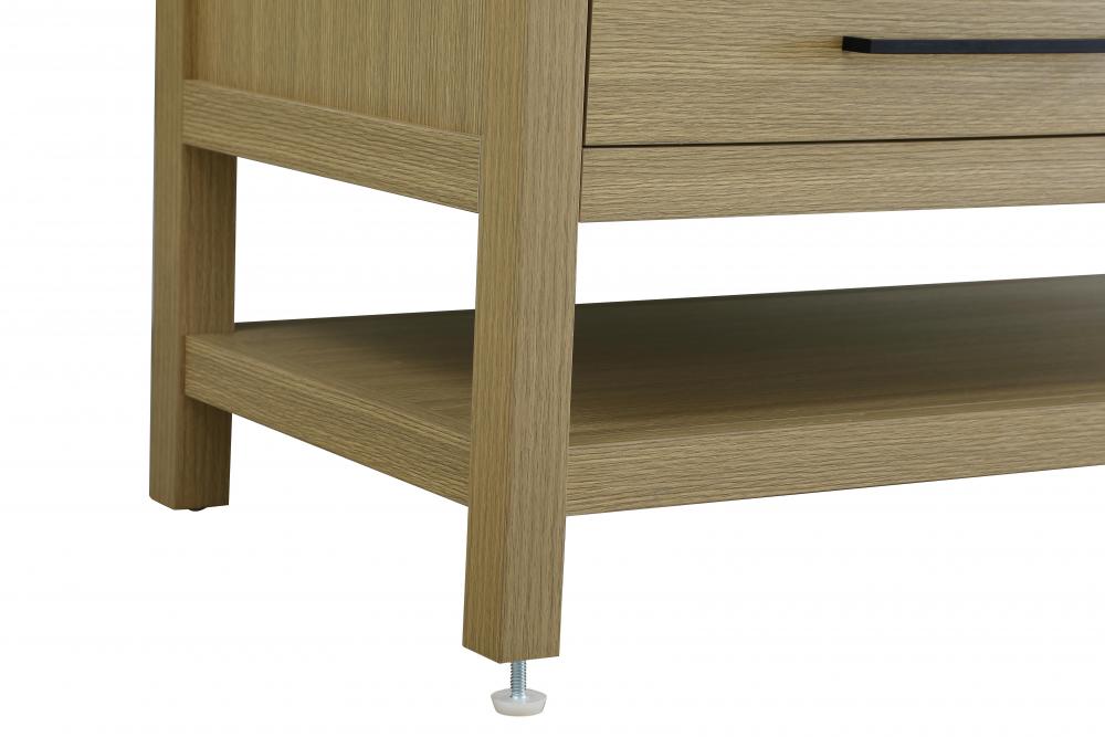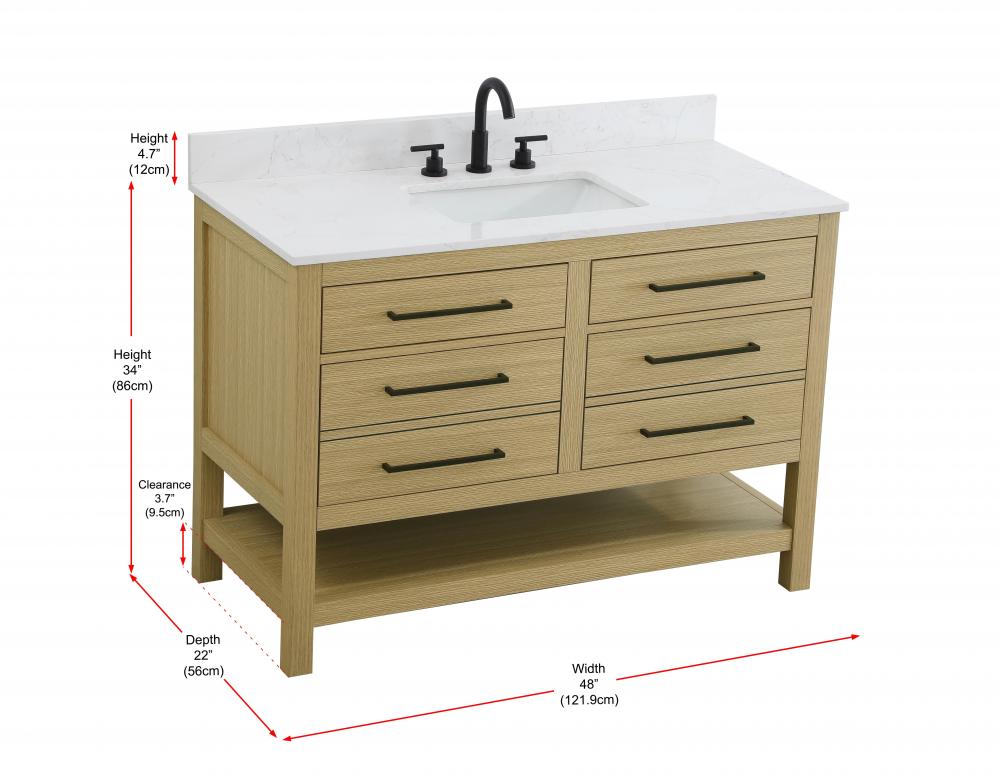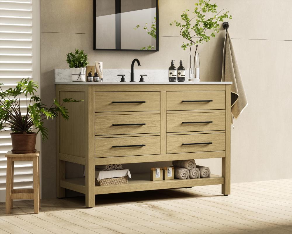 Elevate your bathroom design with this versatile and beautifully crafted bathroom vanity cabinet. The engineered marble top features striking veining, adding a luxurious focal point to your space. Built from premium solid wood and MDF, it ensures long-lasting durability and strength. The porcelain sink, complete with a concealed overflow, offers a seamless and refined finish. Available in four stunning finishes—Chestnut Brown, Honey Brown, Mocha Brown, and White—this vanity suits any interior style. Designed with convenience in mind, it features soft-closing drawers with modern handles and a tip-out drawer for easy access to small essentials, keeping your space tidy. The bottom deep drawer mimics the appearance of two separate drawers, providing ample storage for larger items, while the open shelf at the base offers additional storage space for towels or decor. Fully assembled for your convenience, it includes foot levelers for stability on any surface. For a complete look, pair it with a matching backsplash. UPC certified for quality assurance, this vanity is the perfect combination of functionality, style, and ease of use.