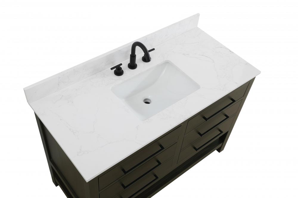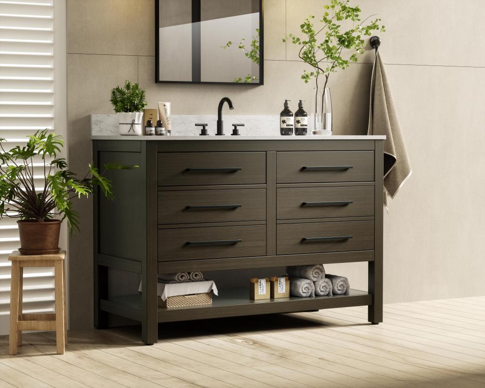 Elevate your bathroom design with this versatile and beautifully crafted bathroom vanity cabinet. The engineered marble top features striking veining, adding a luxurious focal point to your space. Built from premium solid wood and MDF, it ensures long-lasting durability and strength. The porcelain sink, complete with a concealed overflow, offers a seamless and refined finish. Available in four stunning finishes—Chestnut Brown, Honey Brown, Mocha Brown, and White—this vanity suits any interior style. Designed with convenience in mind, it features soft-closing drawers with modern handles and a tip-out drawer for easy access to small essentials, keeping your space tidy. The bottom deep drawer mimics the appearance of two separate drawers, providing ample storage for larger items, while the open shelf at the base offers additional storage space for towels or decor. Fully assembled for your convenience, it includes foot levelers for stability on any surface. For a complete look, pair it with a matching backsplash. UPC certified for quality assurance, this vanity is the perfect combination of functionality, style, and ease of use.