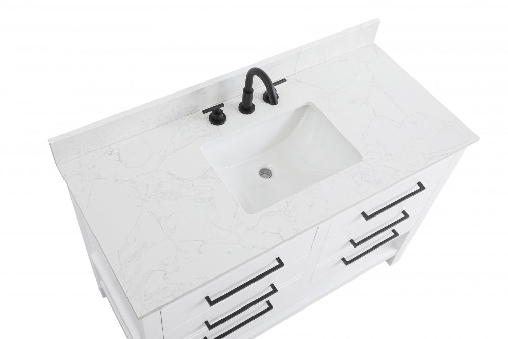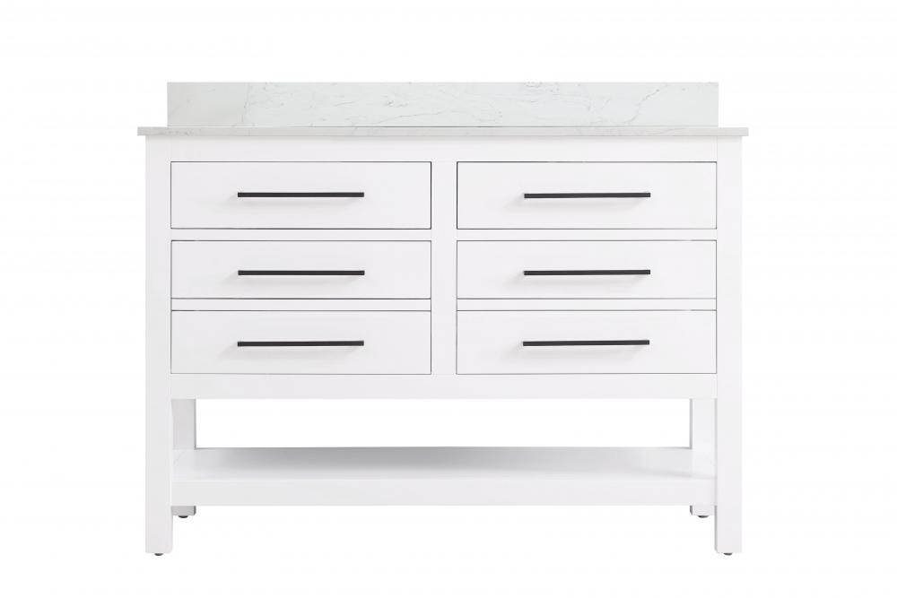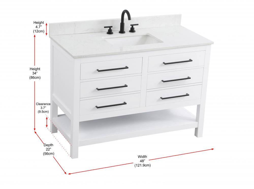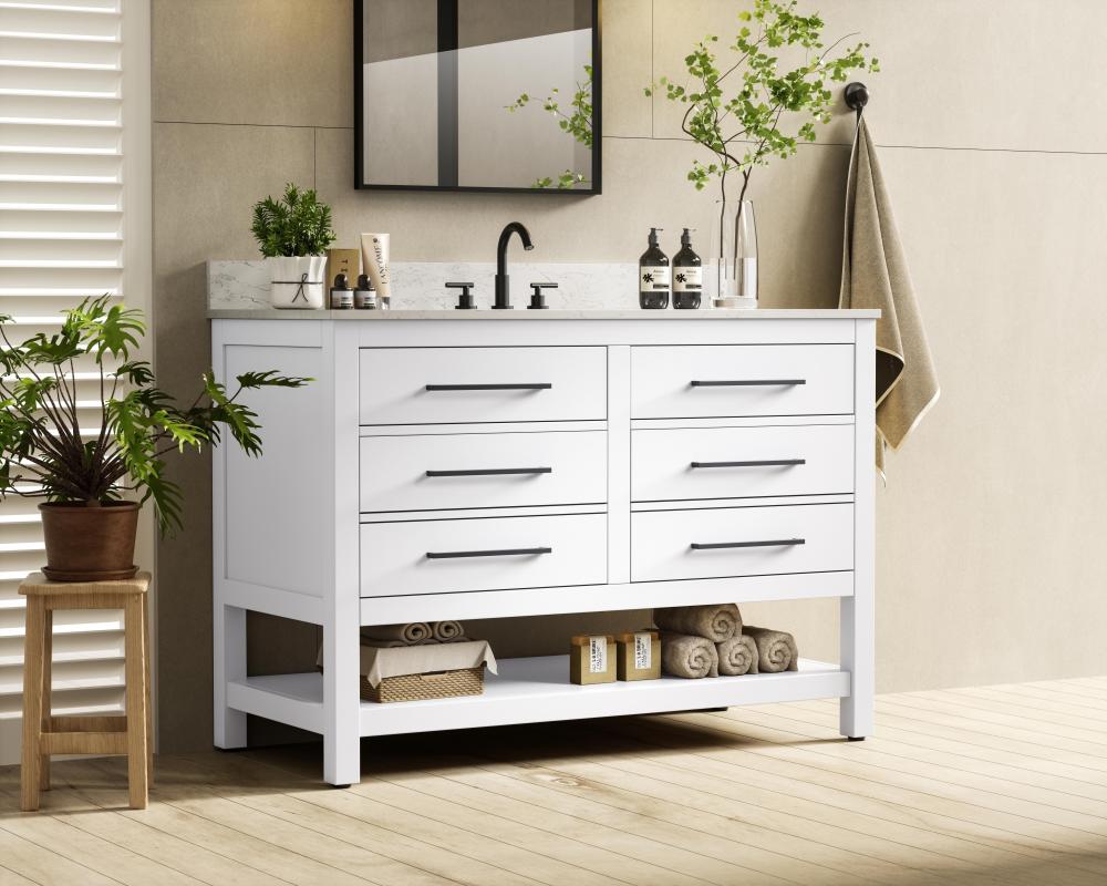 Elevate your bathroom design with this versatile and beautifully crafted bathroom vanity cabinet. The engineered marble top features striking veining, adding a luxurious focal point to your space. Built from premium solid wood and MDF, it ensures long-lasting durability and strength. The porcelain sink, complete with a concealed overflow, offers a seamless and refined finish. Available in four stunning finishes—Chestnut Brown, Honey Brown, Mocha Brown, and White—this vanity suits any interior style. Designed with convenience in mind, it features soft-closing drawers with modern handles and a tip-out drawer for easy access to small essentials, keeping your space tidy. The bottom deep drawer mimics the appearance of two separate drawers, providing ample storage for larger items, while the open shelf at the base offers additional storage space for towels or decor. Fully assembled for your convenience, it includes foot levelers for stability on any surface. For a complete look, pair it with a matching backsplash. UPC certified for quality assurance, this vanity is the perfect combination of functionality, style, and ease of use.