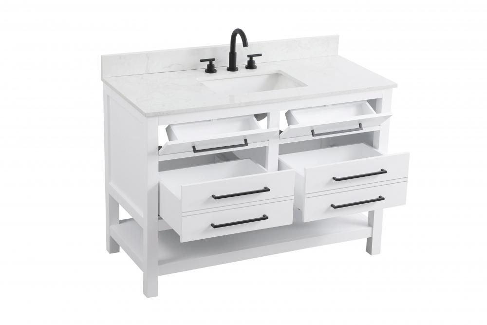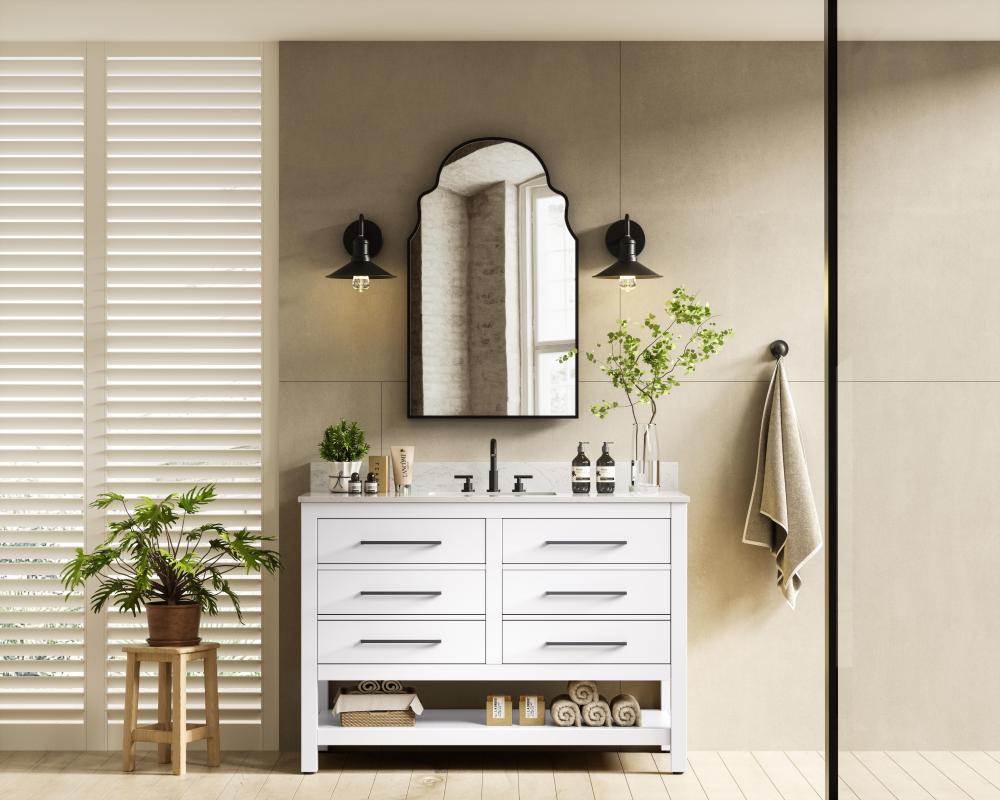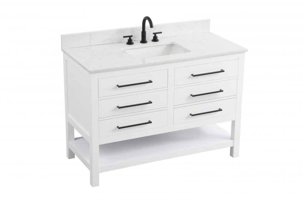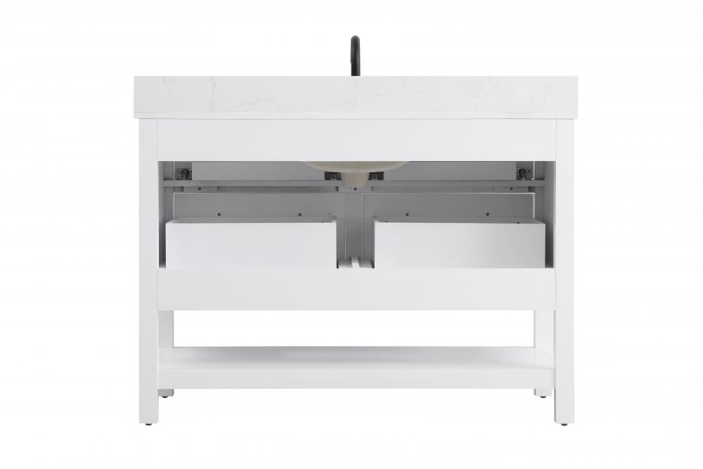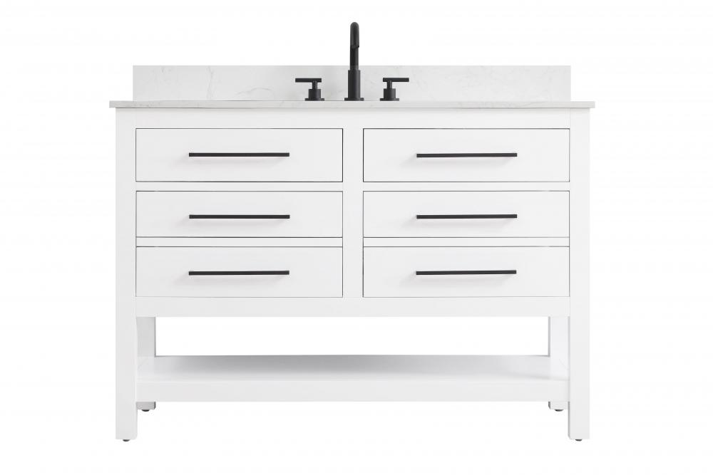Elevate your bathroom design with this versatile and beautifully crafted bathroom vanity cabinet. The engineered marble top features striking veining, adding a luxurious focal point to your space. Built from premium solid wood and MDF, it ensures long-lasting durability and strength. The porcelain sink, complete with a concealed overflow, offers a seamless and refined finish. Available in four stunning finishes—Chestnut Brown, Honey Brown, Mocha Brown, and White—this vanity suits any interior style. Designed with convenience in mind, it features soft-closing drawers with modern handles and a tip-out drawer for easy access to small essentials, keeping your space tidy. The bottom deep drawer mimics the appearance of two separate drawers, providing ample storage for larger items, while the open shelf at the base offers additional storage space for towels or decor. Fully assembled for your convenience, it includes foot levelers for stability on any surface. For a complete look, pair it with a matching backsplash. UPC certified for quality assurance, this vanity is the perfect combination of functionality, style, and ease of use.