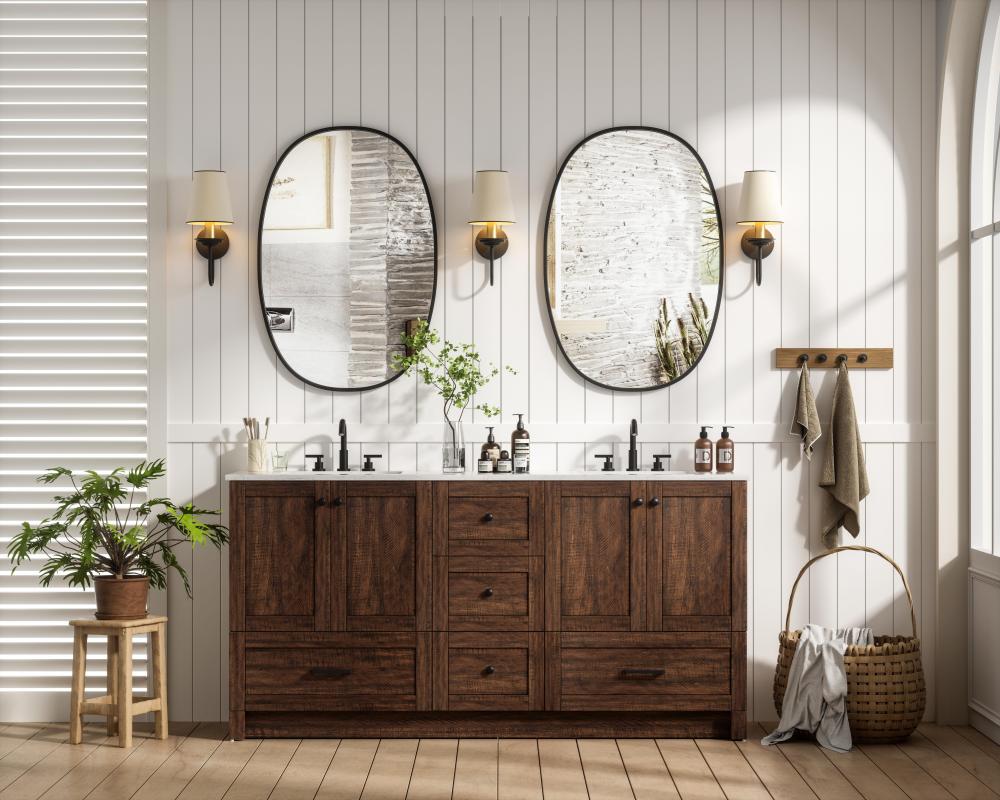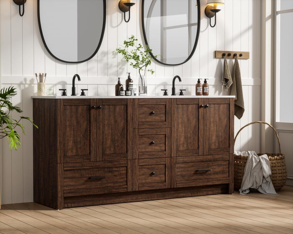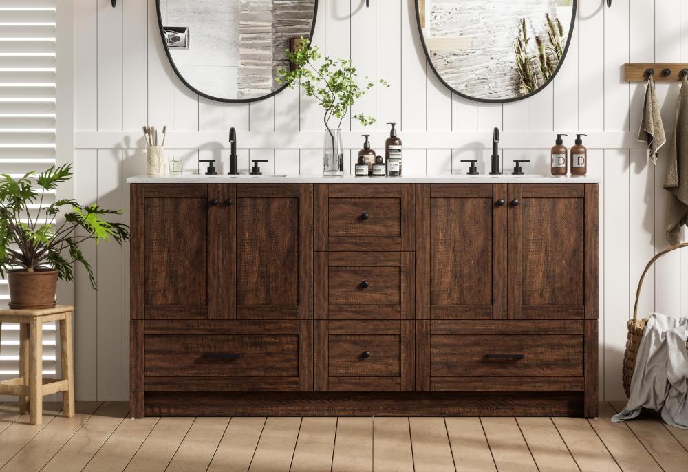 Revel in the beauty of a vanity that mimics the charm of real wood without the maintenance, boasting a faux wood look that adds a touch of natural warmth and rustic sophistication to your bathroom.