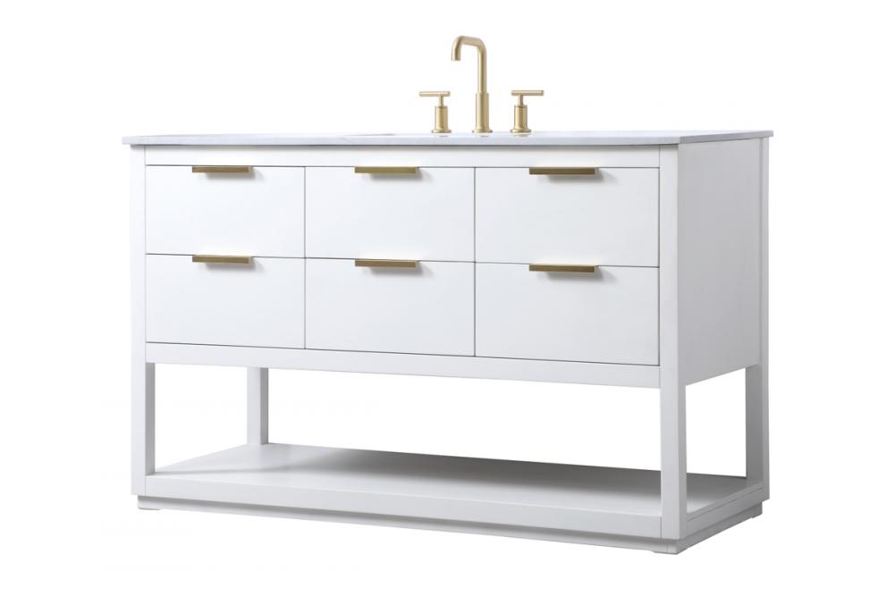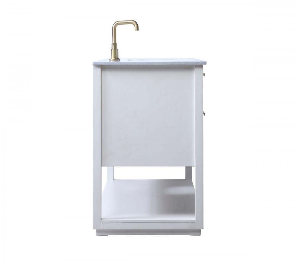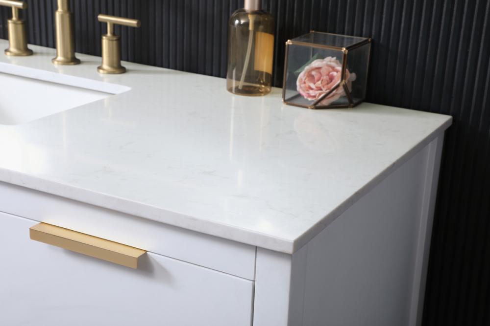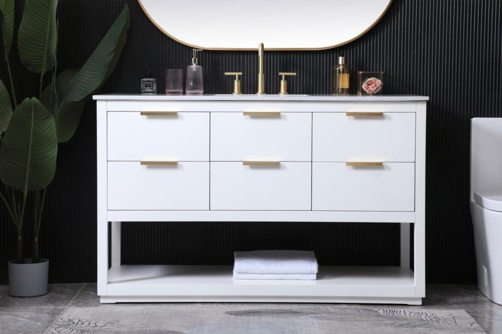 Elevate your bathroom effortlessly with our stylish vanity. Featuring an engineered marble top and chic straight edge cut, it brings a touch of modern elegance. The soft-close drawers, adorned with sleek pulls, offers both convenient storage and a contemporary aesthetic. Completing the ensemble, an undermount porcelain sink adds timeless charm. The vanity's open shelf at the bottom provides extra storage and a space to showcase decor. As a freestanding unit, this hassle-free solution requires no assembly. Customize your space effortlessly with this sophisticated option for instant bathroom elegance.