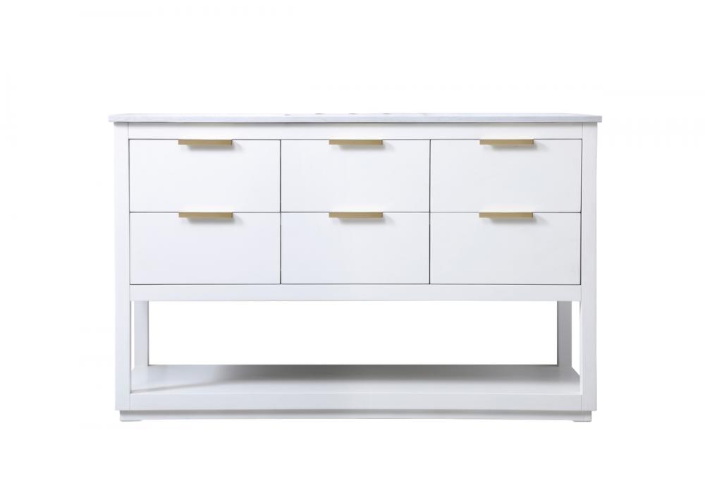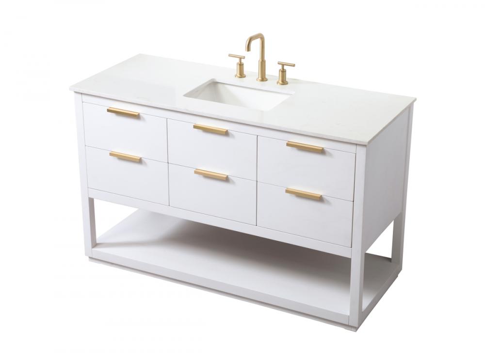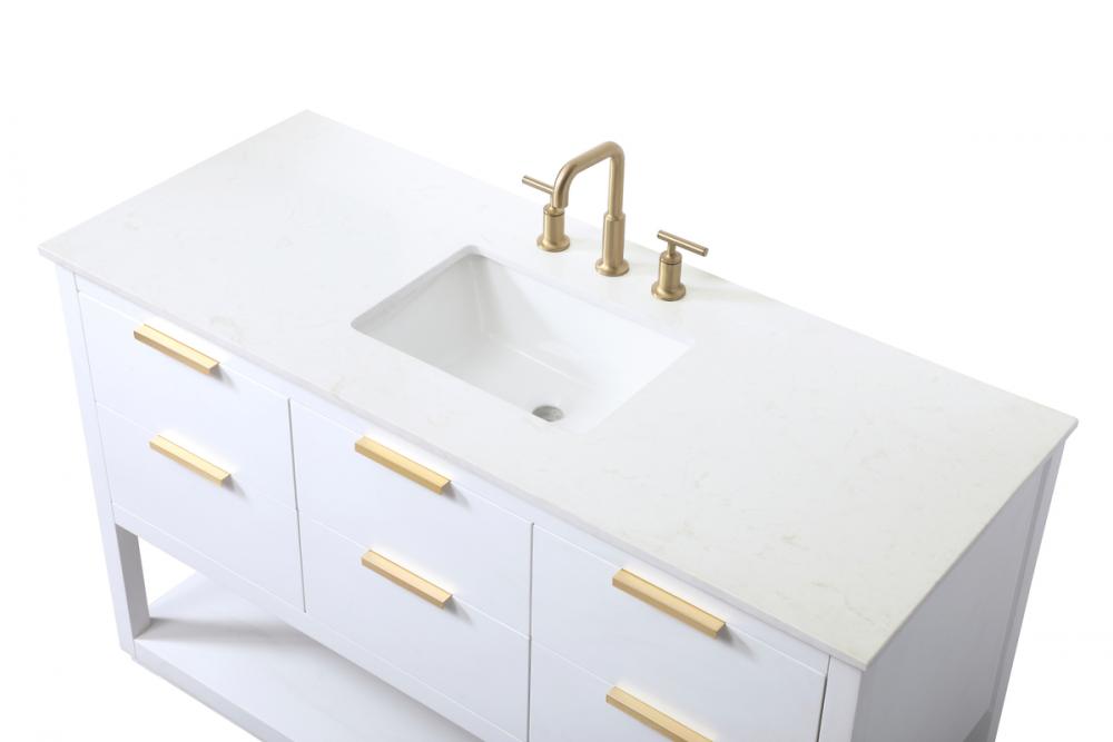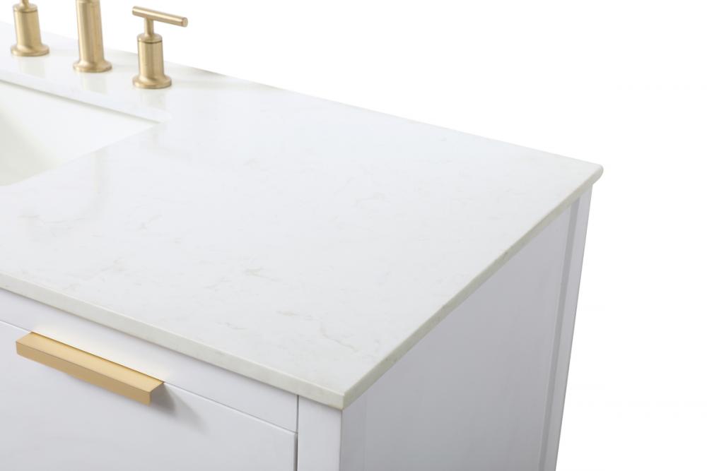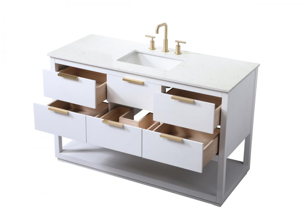 Elevate your bathroom effortlessly with our stylish vanity. Featuring an engineered marble top and chic straight edge cut, it brings a touch of modern elegance. The soft-close drawers, adorned with sleek pulls, offers both convenient storage and a contemporary aesthetic. Completing the ensemble, an undermount porcelain sink adds timeless charm. The vanity's open shelf at the bottom provides extra storage and a space to showcase decor. As a freestanding unit, this hassle-free solution requires no assembly. Customize your space effortlessly with this sophisticated option for instant bathroom elegance.