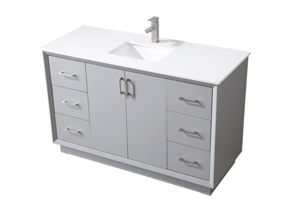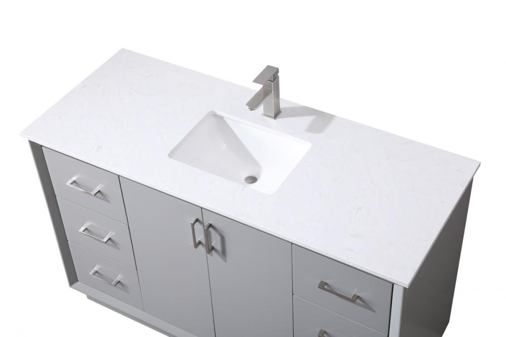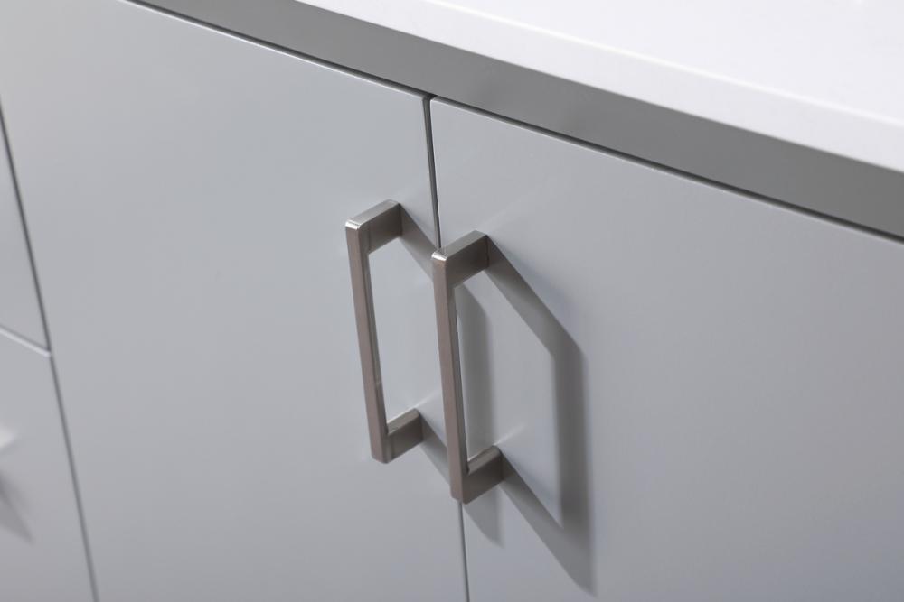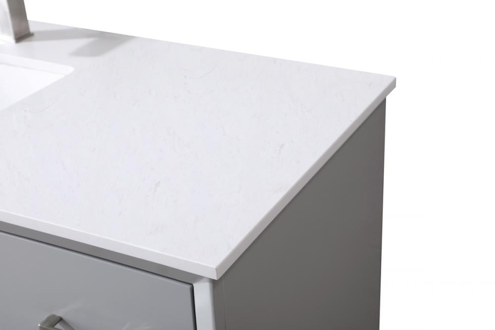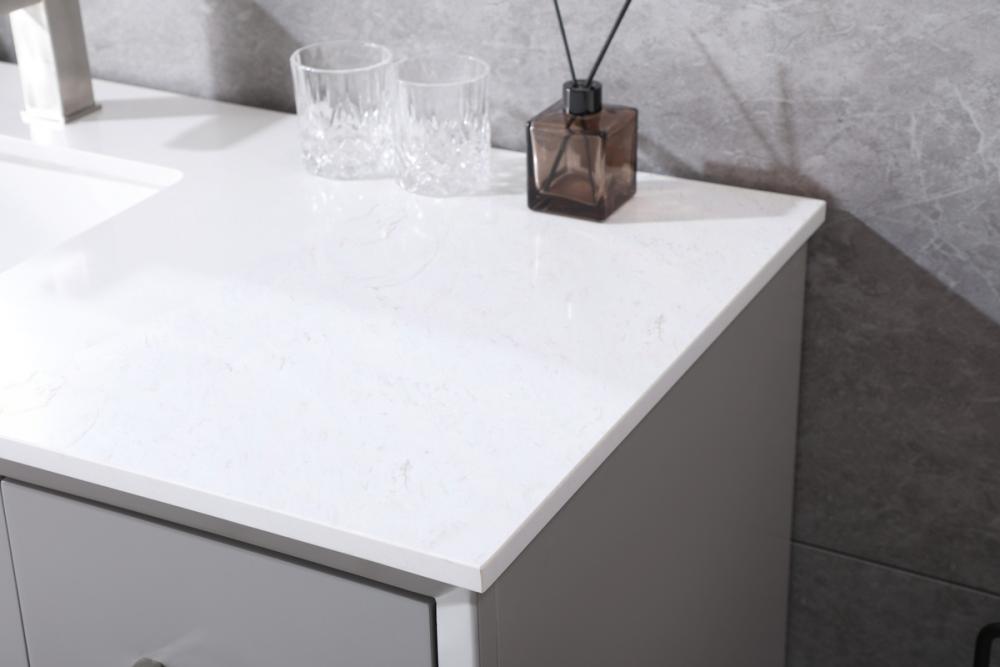 Experience luxury with a 0.75-inch thick engineered marble countertop featuring a calacatta design with light grey veining, seamlessly blending durability with timeless elegance.