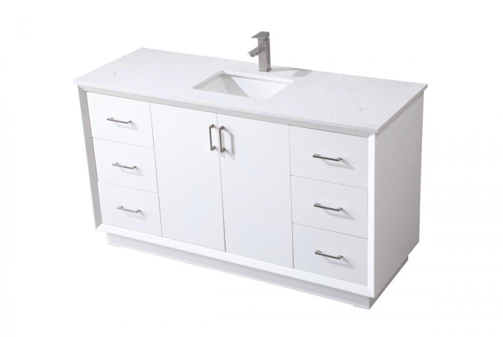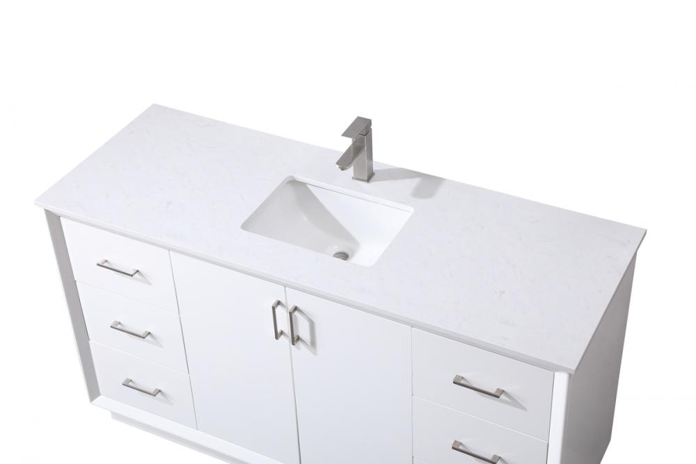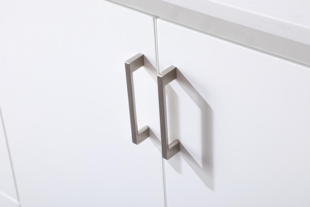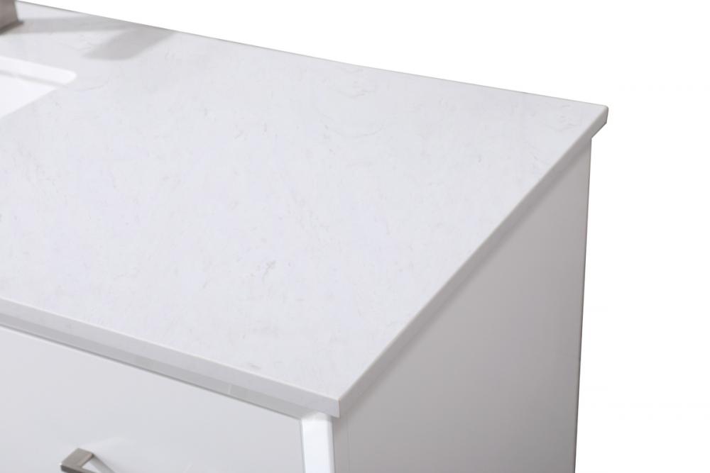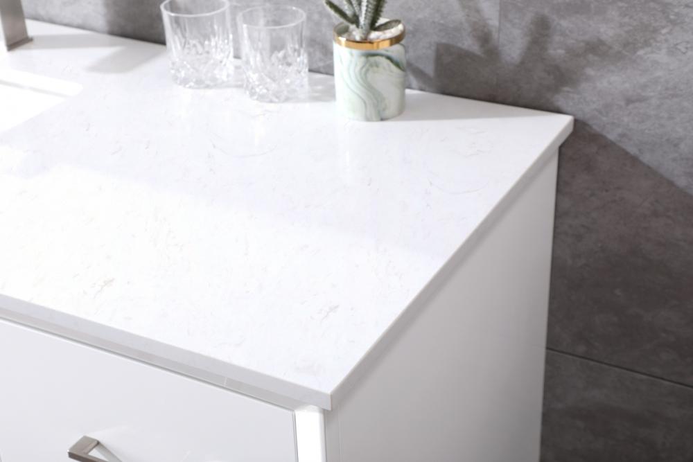 Experience luxury with a 0.75-inch thick engineered marble countertop featuring a calacatta design with light grey veining, seamlessly blending durability with timeless elegance.