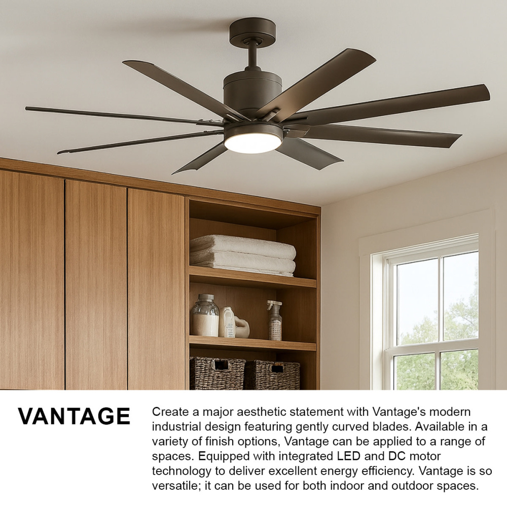 Create a major aesthetic statement with Vantage's modern industrial design featuring gently curved blades. Available in a variety of finish options, Vantage can be applied to a range of spaces. Equipped with integrated LED and DC motor technology to deliver excellent energy efficiency. Vantage is so versatile; it can be used for both indoor and outdoor spaces.