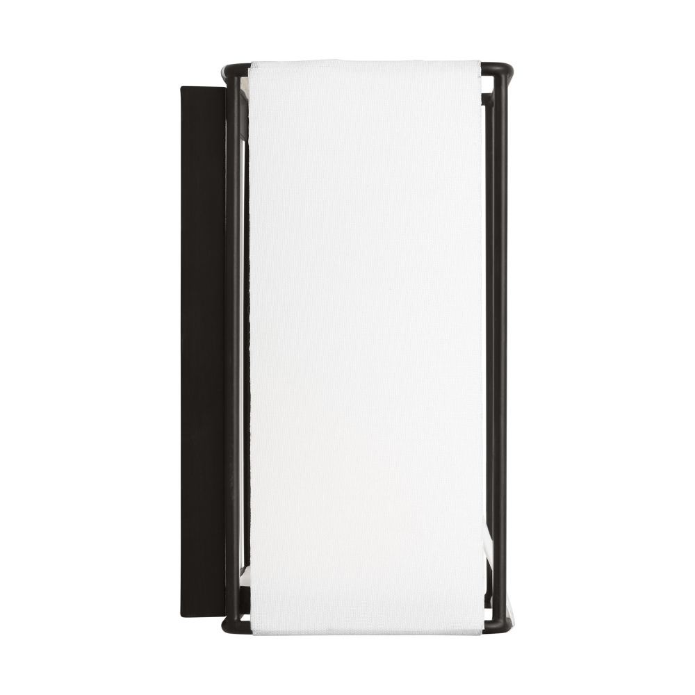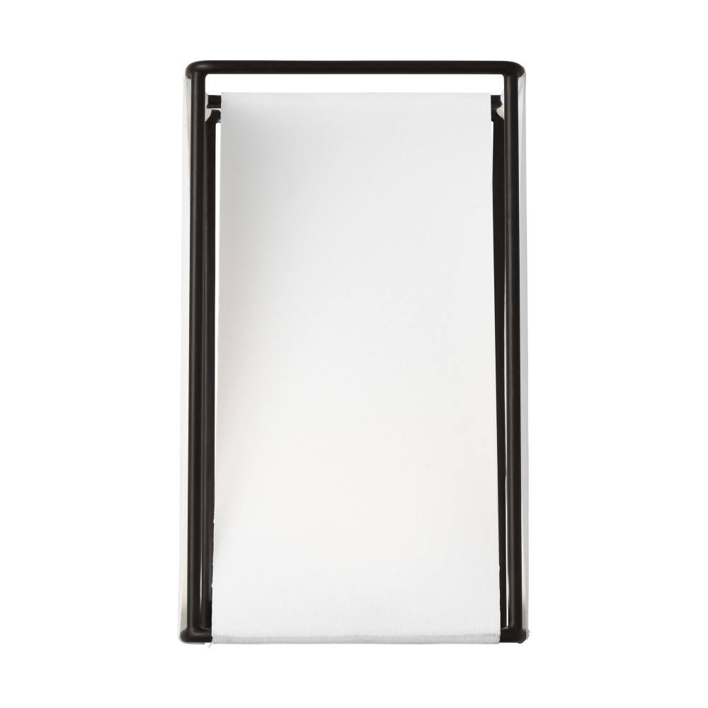 Crafted with Steel in a Aged Iron finish with white linen fabric shade