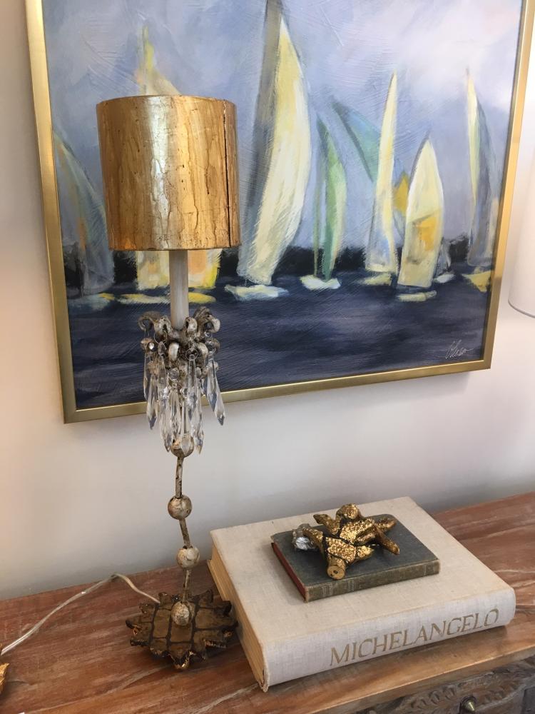 A 30" accent lamp with textured resin, a gold leaf base, and whitewashed wrought iron column. Topped with a 6" shade, its sophisticated glam and crystal accents suit entryways or dining rooms paired with vintage decor.