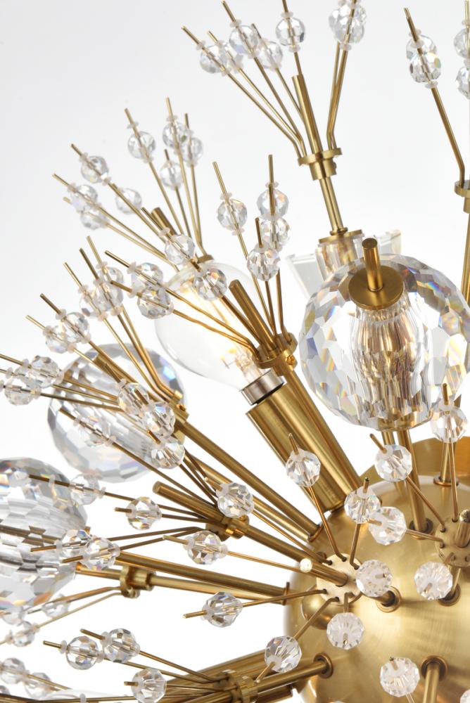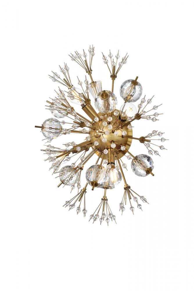 Like an explosion frozen in time, Vera collection are suspended chaos. Clear large crystal balls and sprays of smaller crystals swirl amidst exposed candelabra bulbs (not included). At the epicenter of the storm, a hemispherical steel backplate in a metal finish attaches to the wall or the ceiling. A touch of savage beauty that easily compliments a bathroom, entryway, or bedroom.