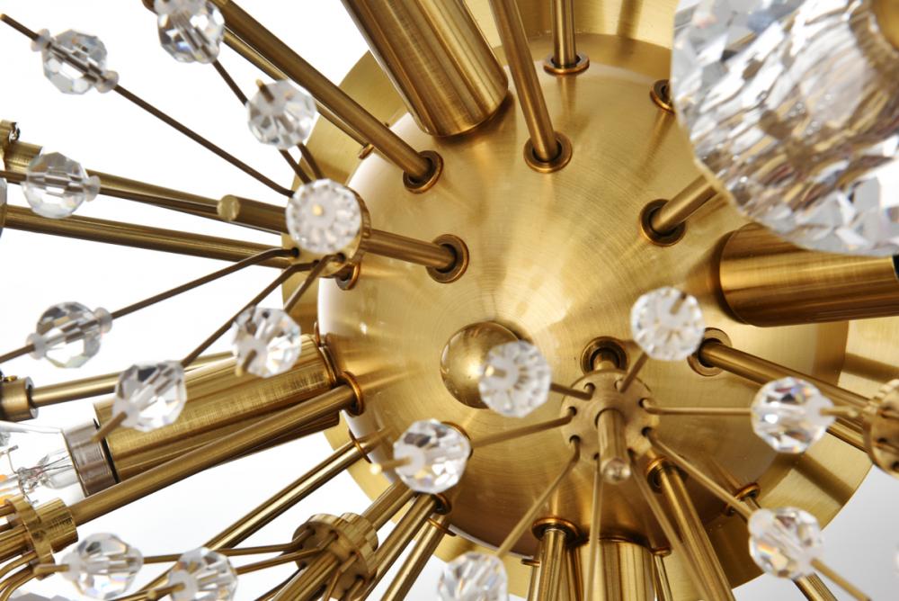 Light is diffused by the clear crystal accents strung on the slender metal arms