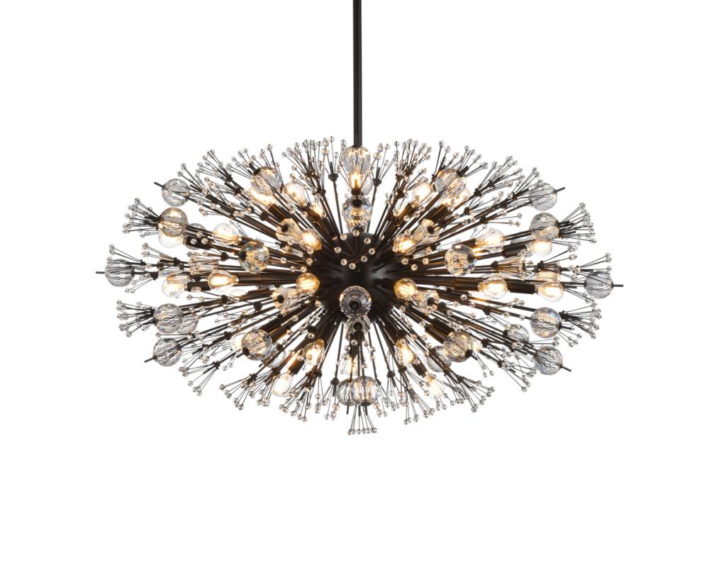 Like an explosion frozen in time, Vera collection hanging fixtures are suspended chaos. Clear large crystal balls and sprays of smaller crystals swirl amidst exposed candelabra bulbs (not included) balanced on dainty wires. A gleaming steel sphere forms the epicenter of the storm. A touch of savage beauty that easily compliments a kitchen, entryway, or bedroom. Sloped ceiling adaptable with a durable swivel could be mounted on vaulted or angled ceilings