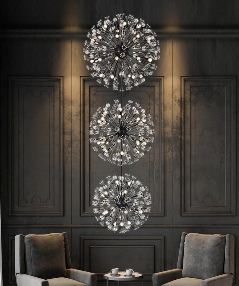 Features a captivating starburst design, creating a visually stunning centerpiece for your foyer. The arrangements of crystal and metal elements in a radial pattern adds a touch of modern elegance and sophistication to any space.