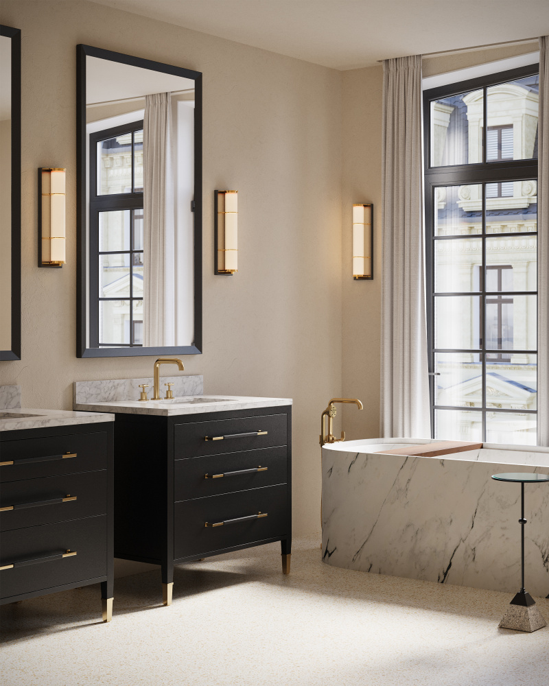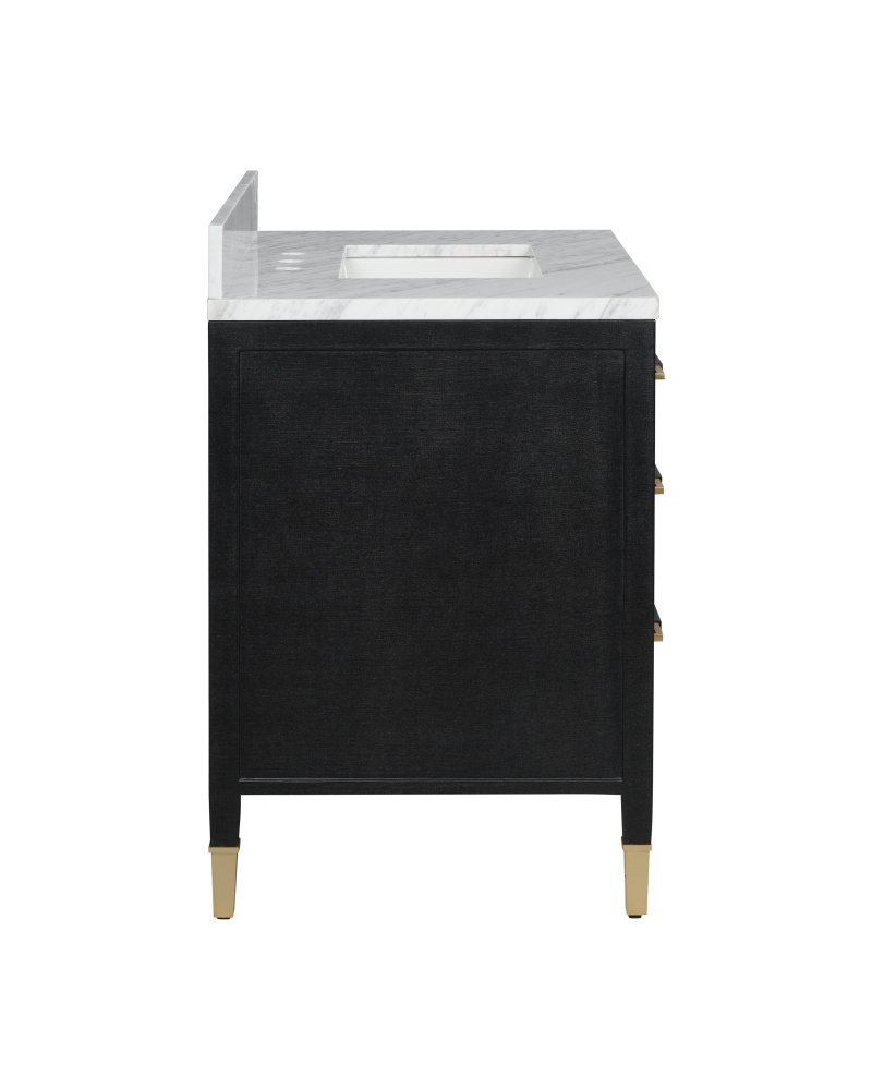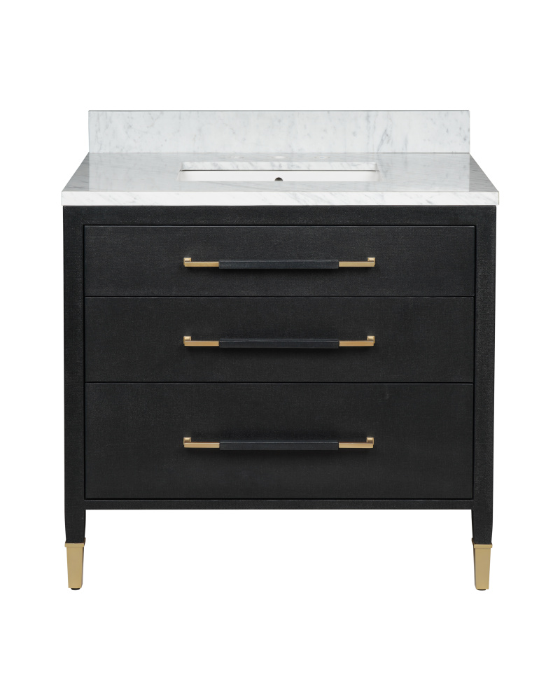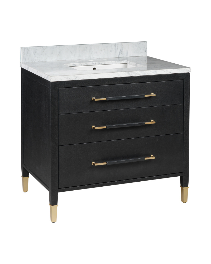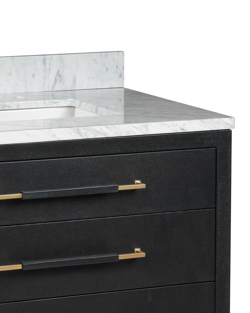 The Verona 36" Black Linen Vanity is covered in black lacquered linen with metal drawer pulls and ferrules in a champagne finish. The vanity has three working drawers, the middle of which has three removable organizational dividers. The white Carrara marble top is fitted with a white rectangular undermount sink. Other fine design attributes include soft-close door hinges and a matching marble backsplash.