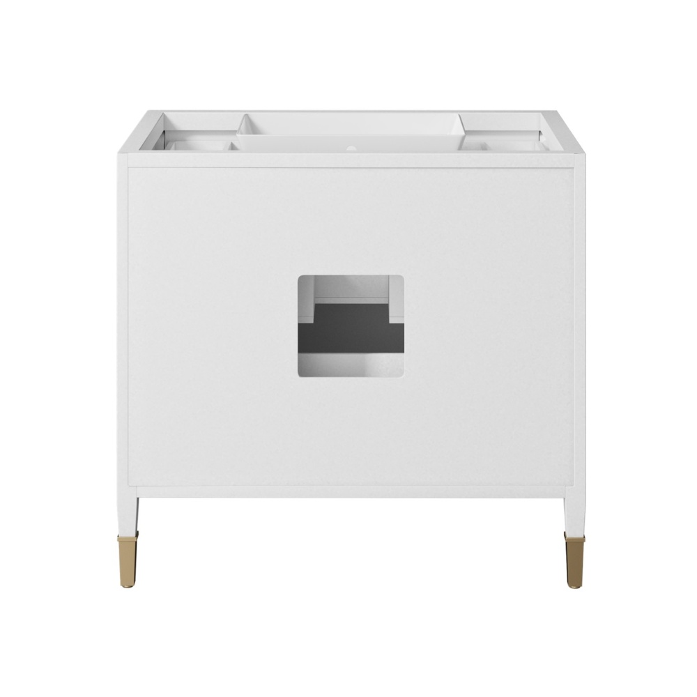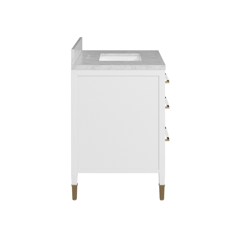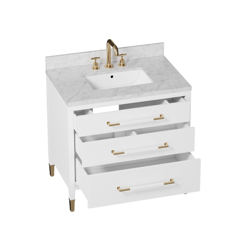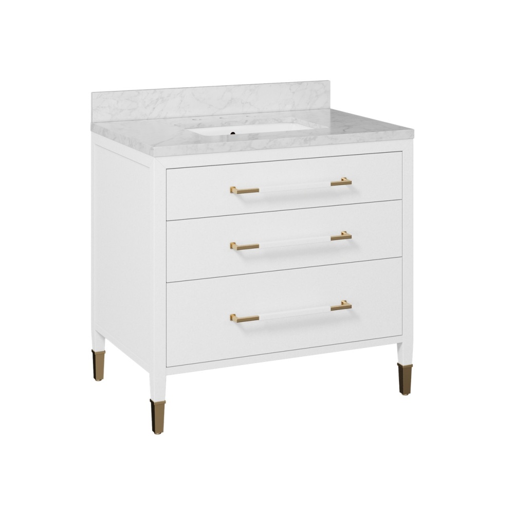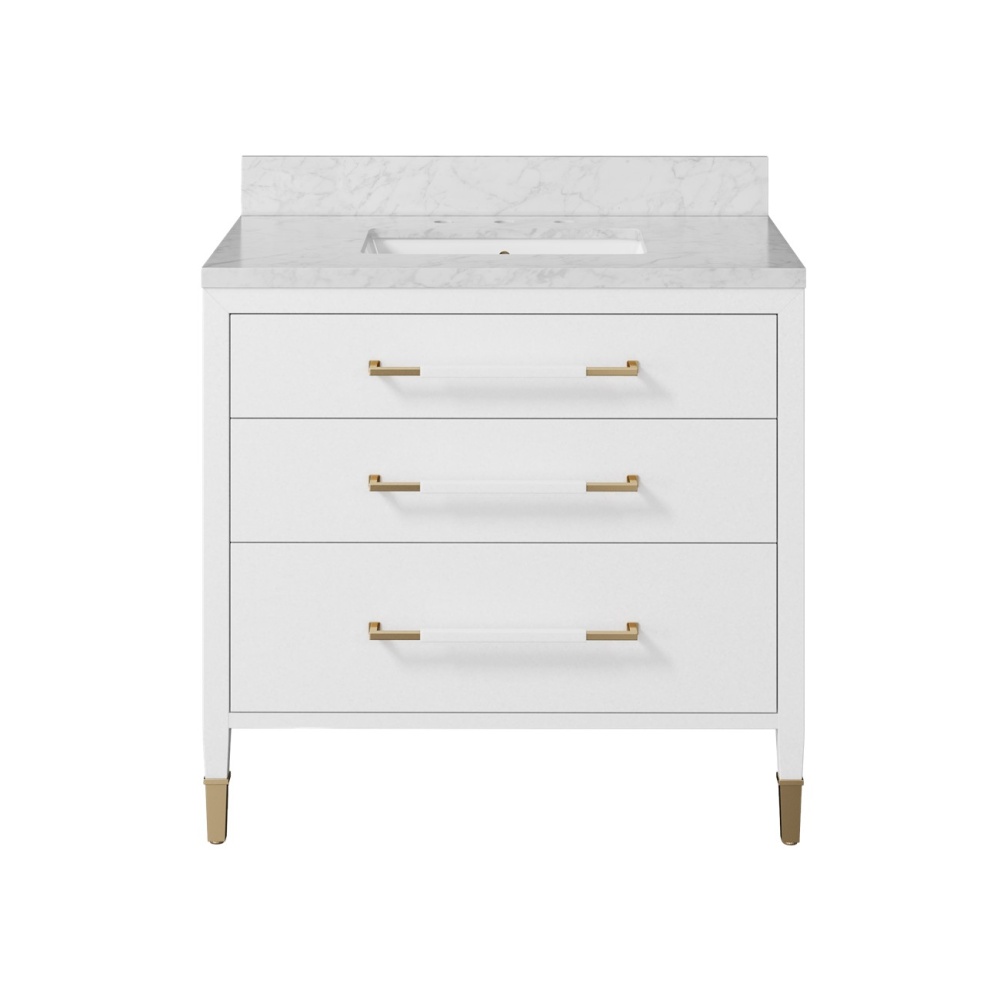 The Verona 36" White Vanity has a white acrylic finish with metal drawer pulls and ferrules in a champagne finish. The vanity has three working drawers, the middle of which has three removable organizational dividers. The white Carrara marble top is fitted with a white rectangular undermount sink. Other fine design attributes include soft-close drawers and a matching marble backsplash.