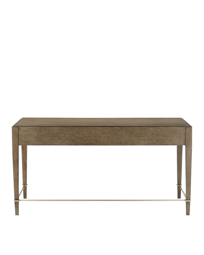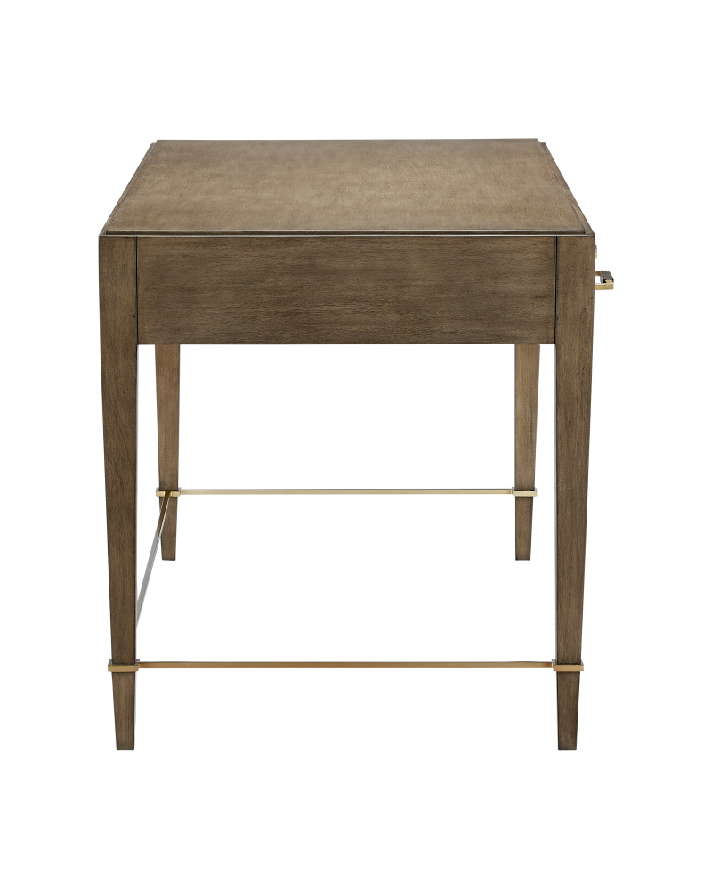 Made of mahogany in a woodland-inspired chanterelle finish, the Verona Chanterelle Desk is warmly handsome with its metal detailing in a champagne finish. The stretchers on this brown desk bring it its flair.