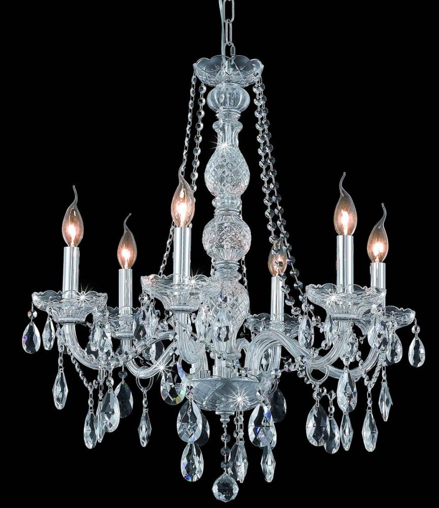 These splendid fixtures from the Verona collection offer all of the ornamentation and details that define a traditional chandelier. Reminiscent of classic styling found throughout Europe for centuries, the elegantly styled masterpieces feature six graceful arms supporting candelabra lights (not included) on crystal bobéches, coalescing at the base of an impressive center column with distinct cut-crystal shapes and strands of crystal beads. Other adornments include crystal droplets, rings, and pendeloques. Available with a choice of finishes and types of crystal.