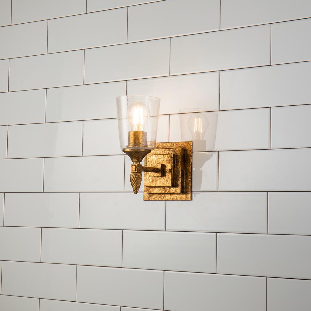 A 1950s-inspired Vetiver sconce in antique gold with a gold finial and seeded glass. Its double square backplate adds vintage charm to bedrooms, dining, nooks, or bathrooms, offering a warm, stylish glow with retro flair.