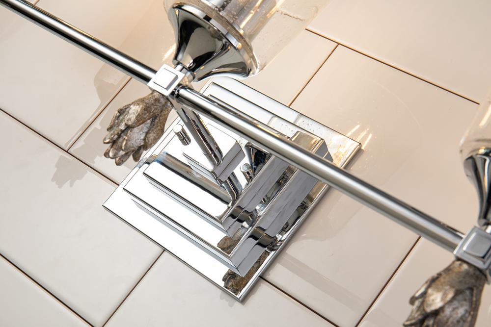 A 1950s-inspired Vetiver sconce in polished chrome with a silver finial and seeded glass. Its double square backplate adds vintage charm to bedrooms, dining, nooks, or bathrooms, blending retro style with sleek, shiny light.
