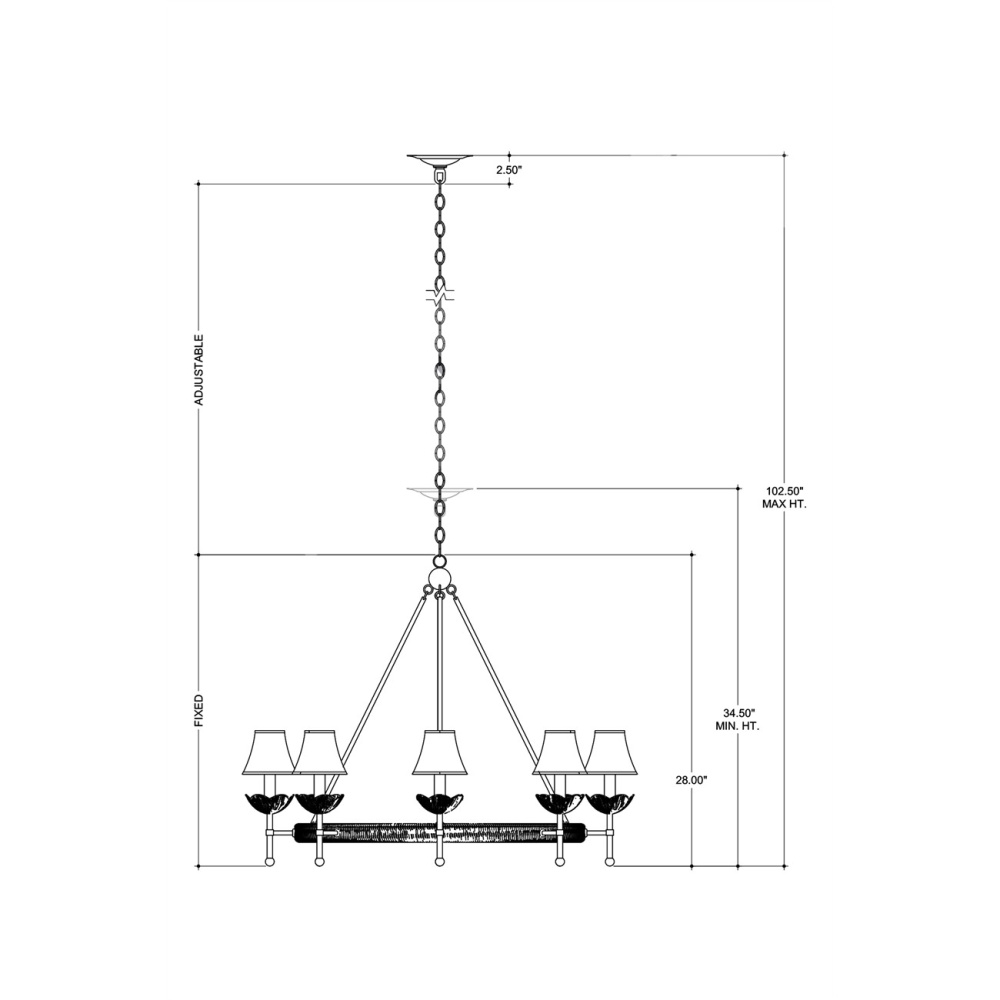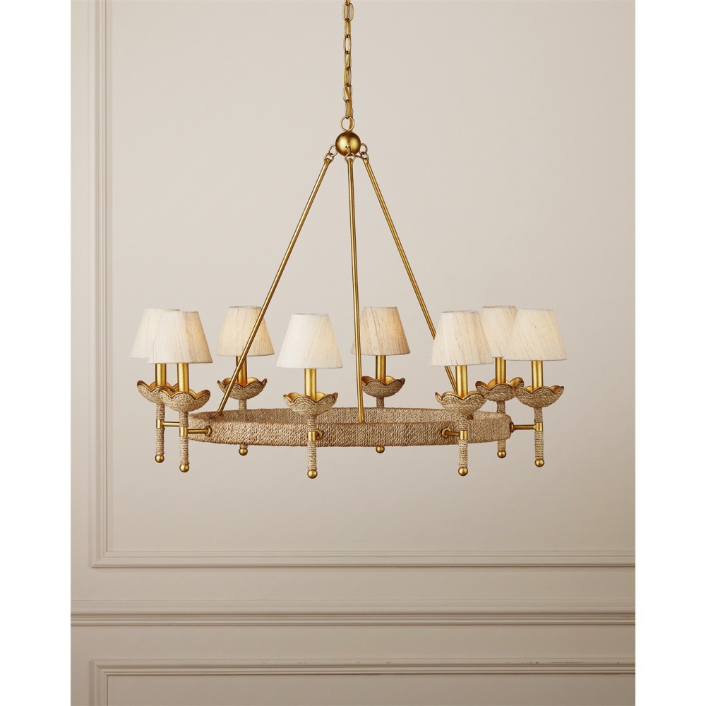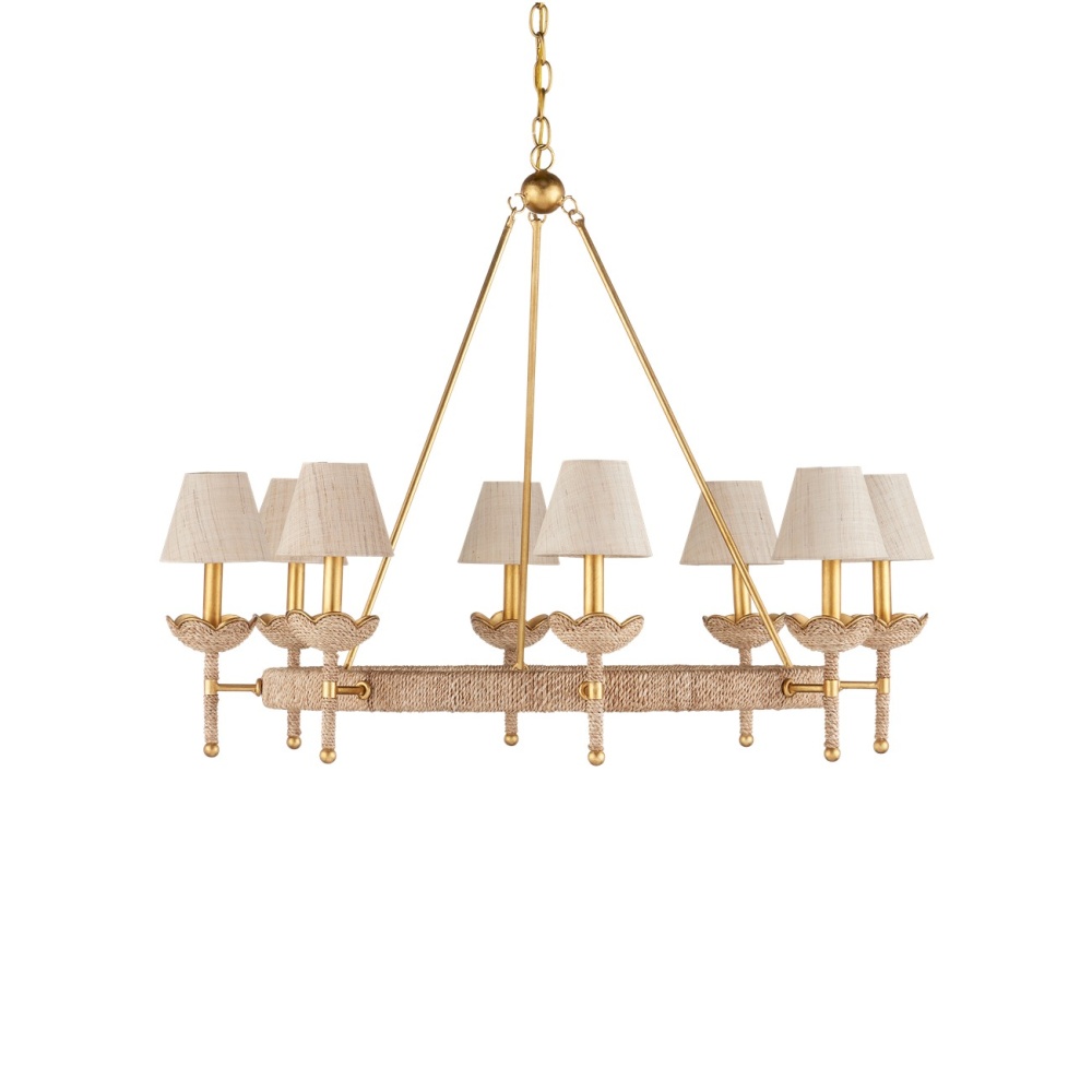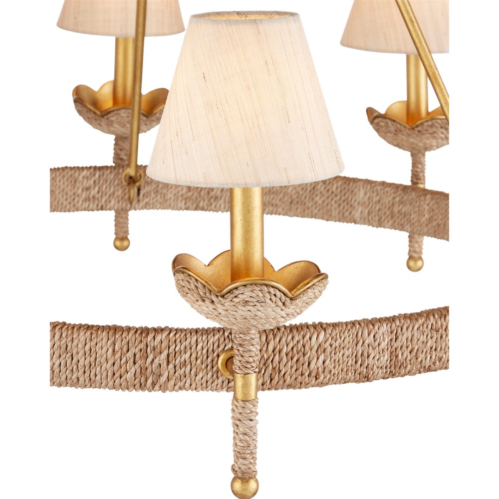 The Vichy Chandelier was created by Suzanne Duin, who founded the Houston shop and design studio Maison Maison, and is known for a keen eye in sourcing authentic French antiques and home accessories from around the globe. Each piece in her line of woven light fixtures is handmade by artisans in Southeast Asia; the Vichy an example in abaca rope and wrought iron in a mix of contemporary gold leaf and contemporary gold finishes. The finely shaped braided edges reflect Parisian style and the overall composition will brings both texture and French flair. Adjustable from 34.5" to 102.5" with use of included chain/rod kit/cable. If your space calls for a longer drop, additional chain/rods/cable is available for purchase.