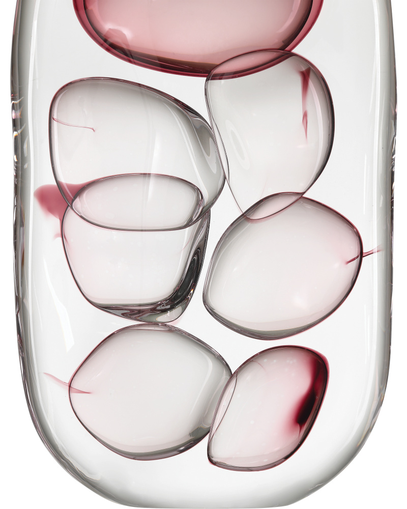 The Vicolino Large Vase is made of clear and purple hand-made glass with organically placed bubbles floating within its overall form. The vase was created using a Venetian glass technique that is very rarely practiced in modern times. The slim silhouette has a shape that is reminiscent of a perfume bottle, the narrowness making the vase ideal for nightstands, smaller consoles, or shelves that are not very deep. Both sculptural and functional, this vase will be a glamorous accent piece in the most sophisticated setting.