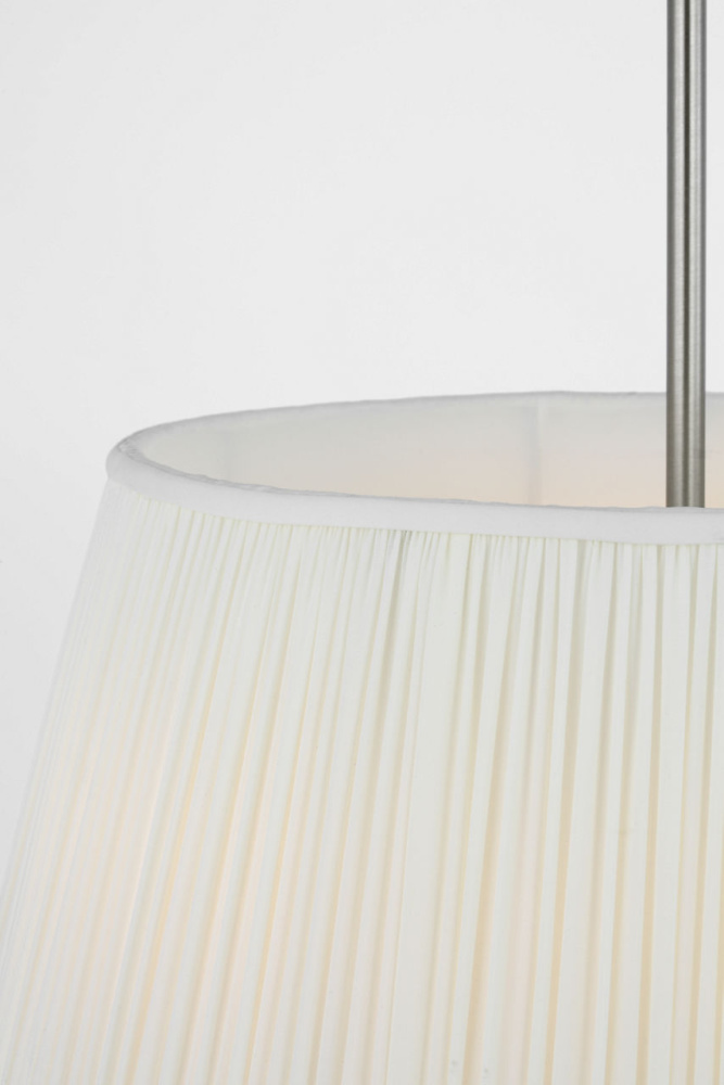The Vilera Three-Light Pendant suspends a single gathered fabric shade with an integrated diffuser, creating soft general illumination with a relaxed character. Ideal over kitchen islands, dining tables, or as a pair in larger spaces, the pendant balances simplicity with tactile expression.