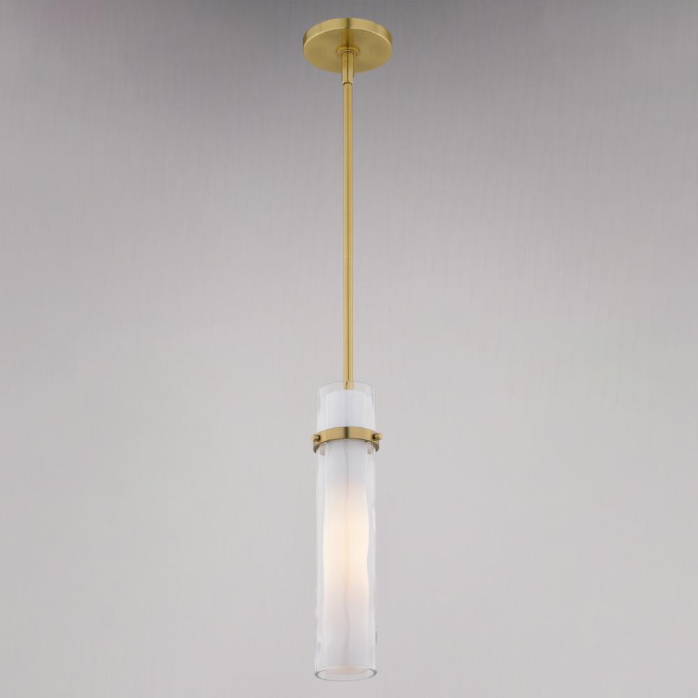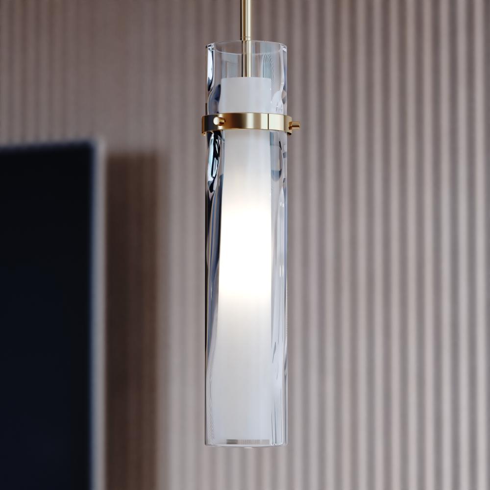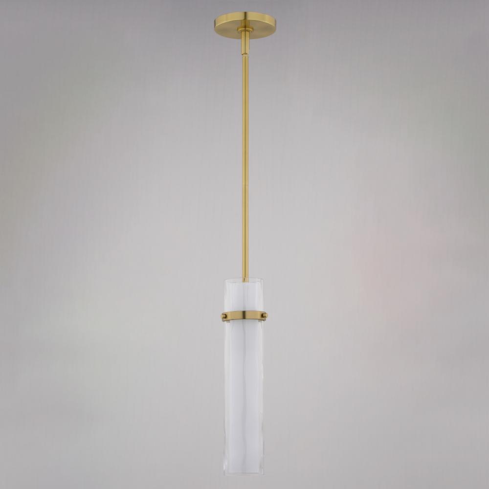 The Vilo collection is a perfect blending of simplicity and sophistication. Flat planes and bands of golden brass are a striking compliment to the more softly defined columns of water glass. Ample light emanates from the vertical glass shades creating a dramatic effect. These fixtures offer a classy touch to any contemporary space in your home. Install this mini pendant individually or in a group; ideal for kitchens, dining areas, or bar areas. Height is adjustable with the included down rods; compatible with sloped ceilings.