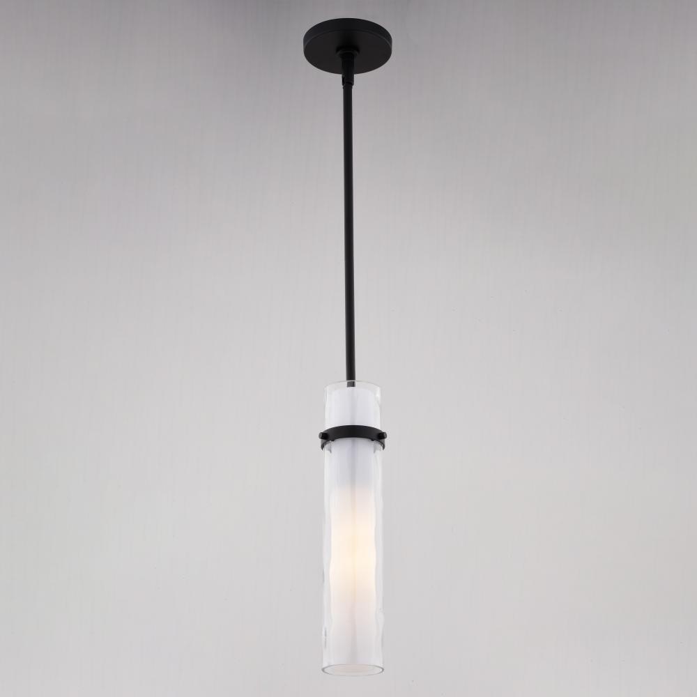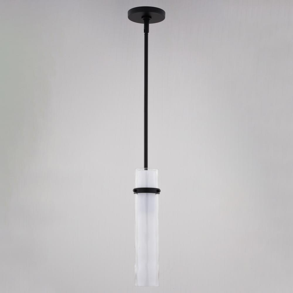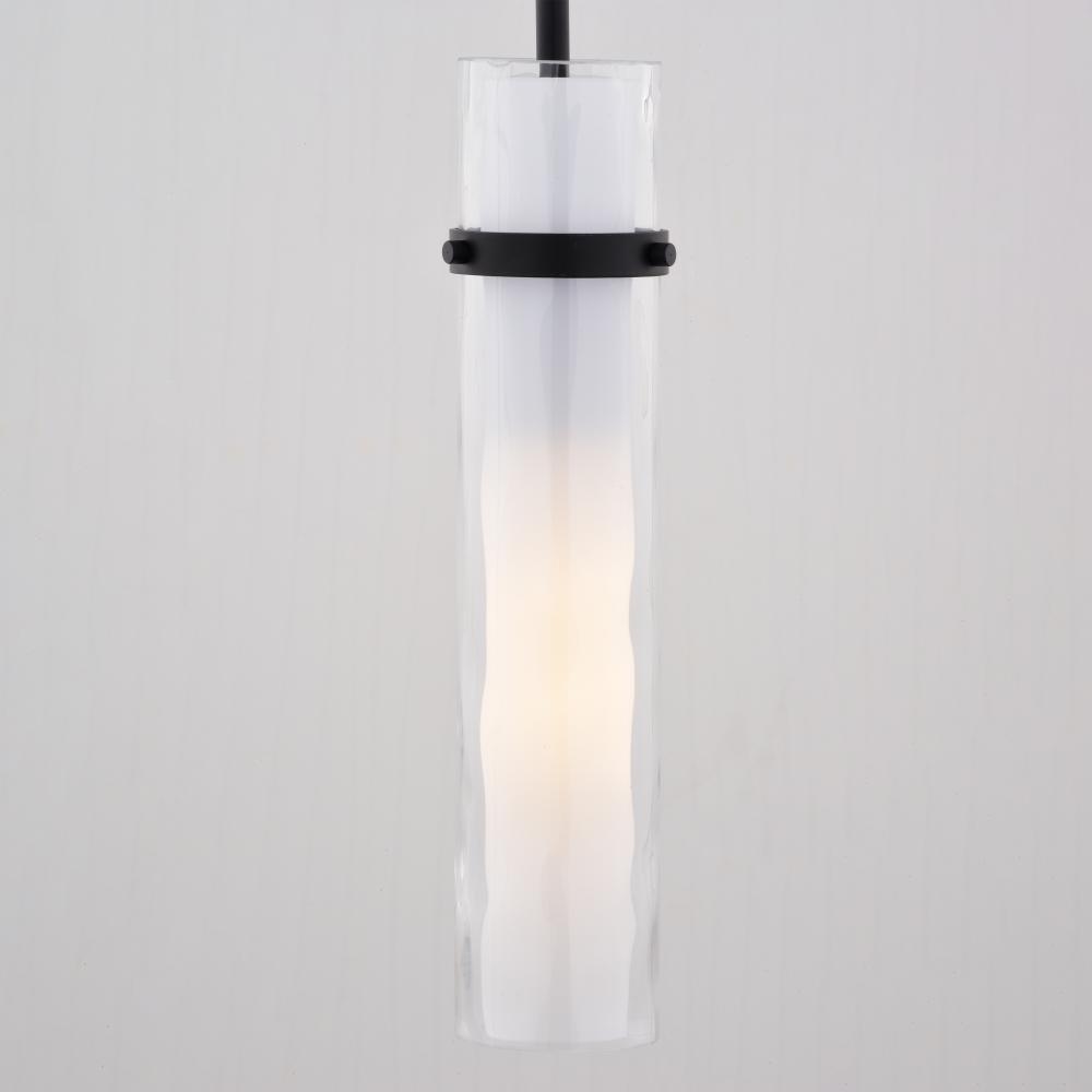 The Vilo collection is a perfect blending of simplicity and sophistication. Flat planes and bands of matte black are a striking compliment to the more softly defined columns of water glass. Ample light emanates from the vertical glass shades creating a dramatic effect. These fixtures offer a classy touch to any contemporary space in your home. Install this mini pendant individually or in a group; ideal for kitchens, dining areas, or bar areas. Height is adjustable with the included down rods; compatible with sloped ceilings.