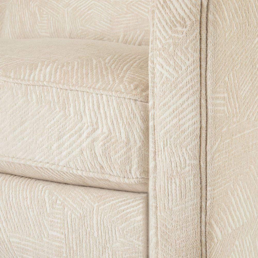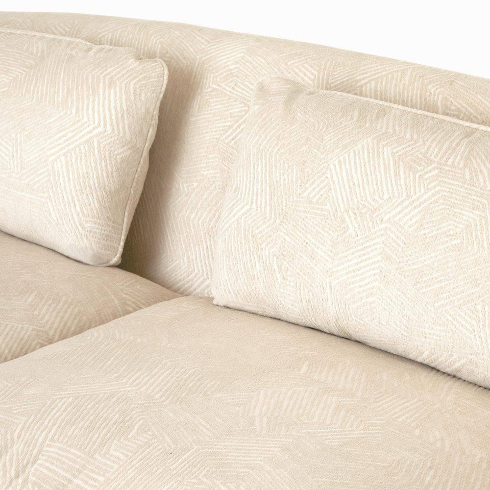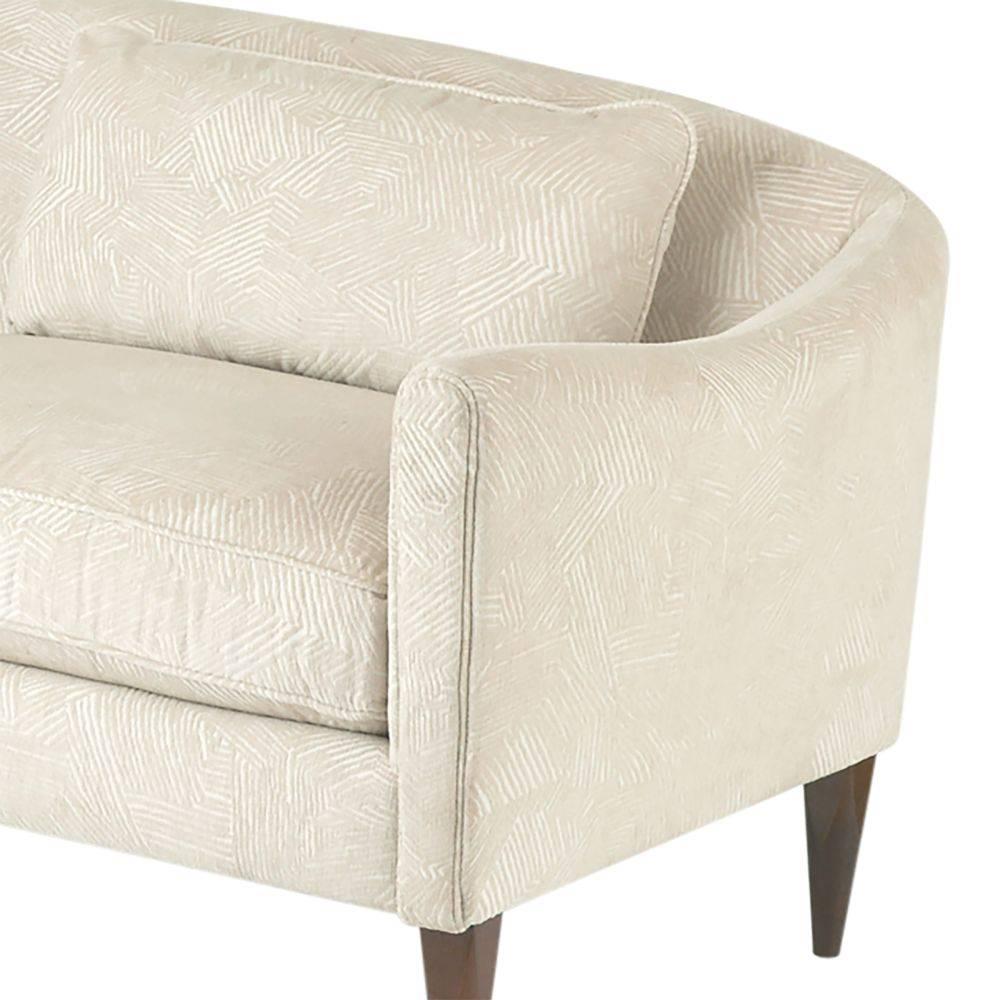 An update of one of our classics, the Vincent sofa was inspired by a vintage Parisian find. Refreshed in a textured ivory tone-on-tone fabric with welting details to accentuate its curves, the matching back cushions are made a little smaller to create a playful imbalance. Sits on dark walnut-finished wooden legs. Finish will vary.