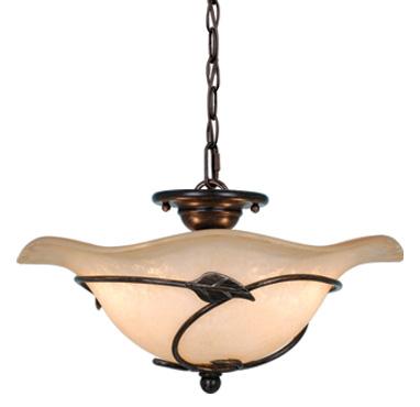 Bring a little of the outdoors inside with the Vine collection. Inspired by nature, this rustic collection features a dark oil shale finish. The amber flake glass shades are scalloped softening the overall feel. Elegantly curved arms are sprinkled with delicately crafted leaves completing the look. This full family of fixtures has something for every room in your home. This semi flush mount ceiling light is ideal for hallways, living rooms, bedrooms, entryways or utility rooms. This versatile fixture can be installed two ways; mount as a semi flush ceiling fixture or use the chain to mount as a pendant.