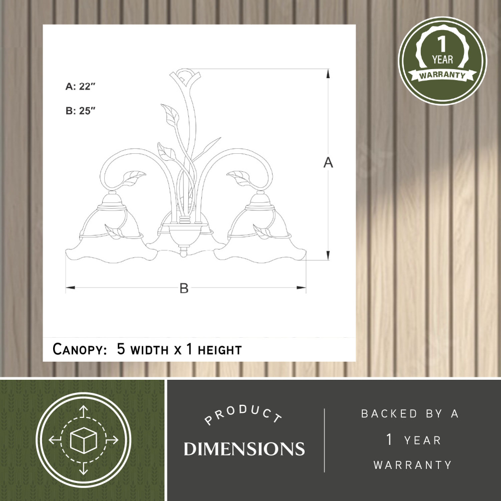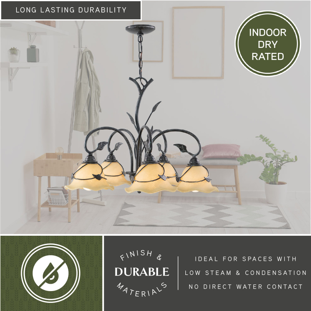 Bring a little of the outdoors inside with the Vine collection. Inspired by nature, this rustic collection features a dark oil shale finish. The amber flake glass shades are scalloped softening the overall feel. Elegantly curved arms are sprinkled with delicately crafted leaves completing the look. This full family of fixtures has something for every room in your home. This chandelier is ideal for kitchens, dining areas, and foyers.