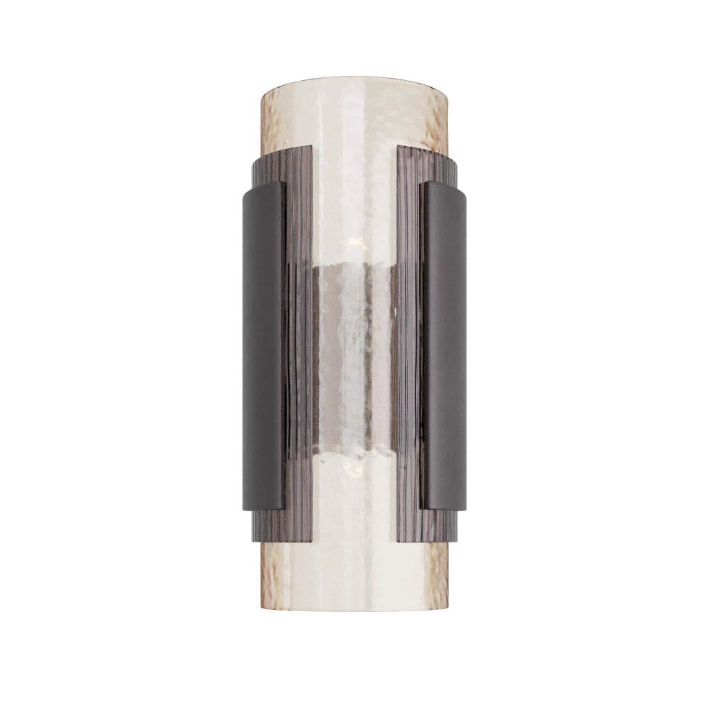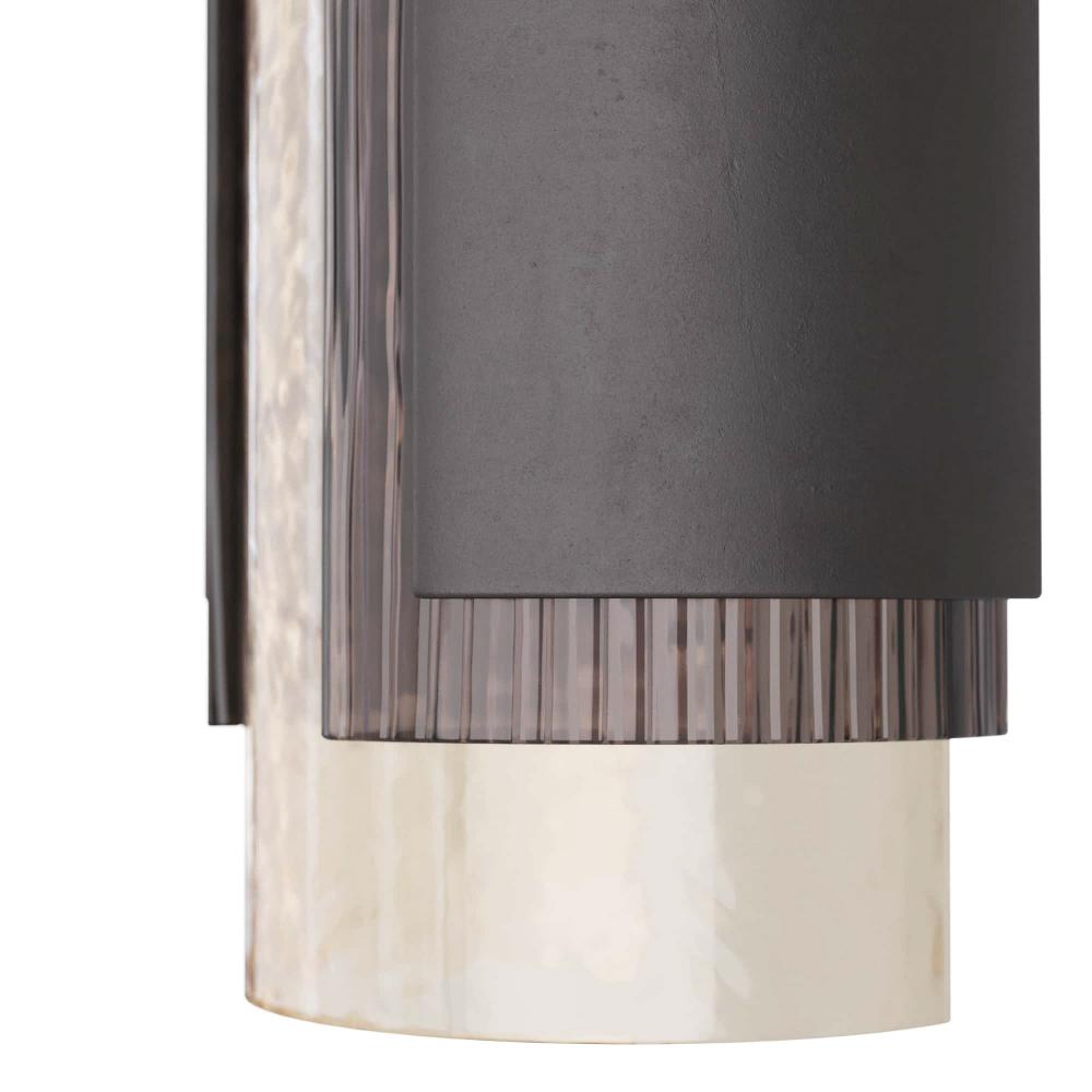 A LAYERED COMPOSITION OF TEXTURED CHAMPAGNE AND SMOKE GLASS CREATE THE MOODY AND MAGICAL VIVIAN SCONCE. INSPIRED BY JEWELRY, THE ARRANGEMENT FEATURES OVERLAPPING GLASS SLEEVES IN STAGGERED SIZES, WITH BRONZE IRON FORMING A CUFF AROUND THE GLASS COLUMN. DAMP-RATED, ALTHOUGH LIMITED COVERED OUTDOOR CONDITIONS MAY AFFECT FINISH.