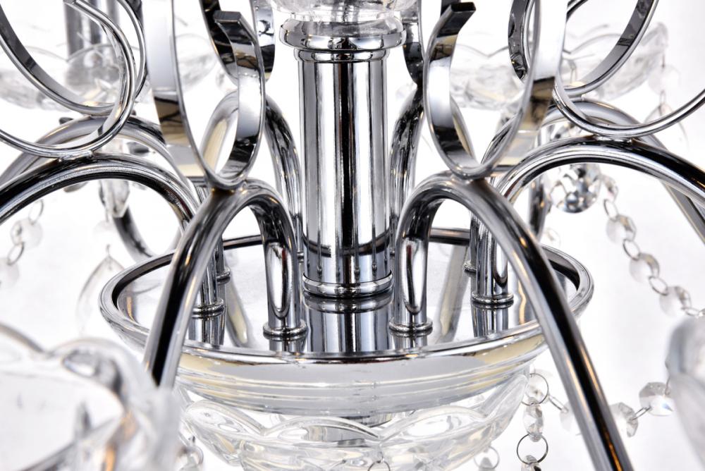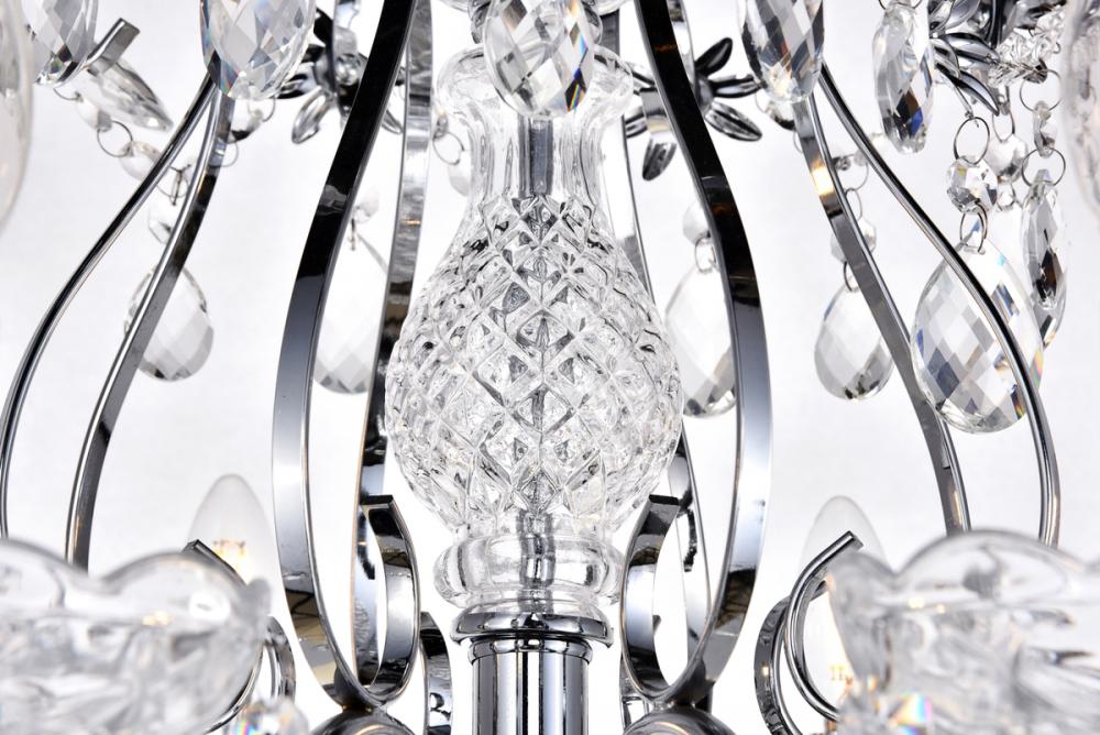 Glamour has never been this enlightening. Voltaire collection hanging fixtures are reinventing the classical chandelier. The graceful frame in a gleaming Chrome finish forms swirling arms that are underscored by dangling festoons of clear Crystal octagon strands and sparkling clear royal-cut Crystal teardrop pendants. An ornate pressed-Glass center column with corresponding bobèches contrast with the tapered Metal flower-shaped accents. With two alternate size options, these chandeliers are ideal for a dining room, stairwell, living room, or bedroom.