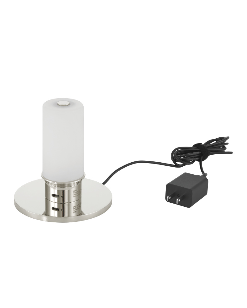 The Voyage Nickel Cordless Table Lamp is a luminous art-glass creation made of layers of glass: first blue is scooped up and blown, then amber is added to the mix, and then clear forms the top layer and realizes the beautiful orb shape. The layering of the first two creates a green effervescence in its center. The portable lamp with its rechargeable bulb configuration is topped with a fabric shade that sits atop polished nickel hardware. Each of the lamps, which look like elegant perfume bottles, will be slightly different because they are mouthblown.