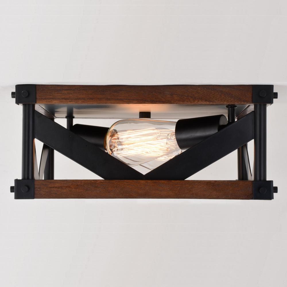Warm, rustic overtones are realized in the collection called Wade. Matte black bands of metal crisscross between two floating frames of solid sycamore wood. This tapered basket-like design surrounds the lamping in perfect harmony. This flush mount ceiling light will bring a warm glow to any bedroom, hallway, kitchen or living area of your home.