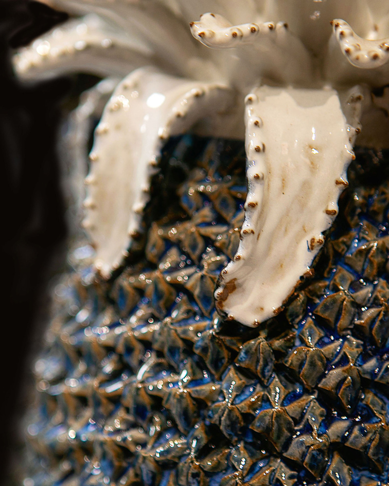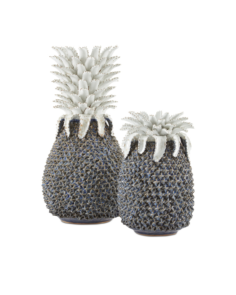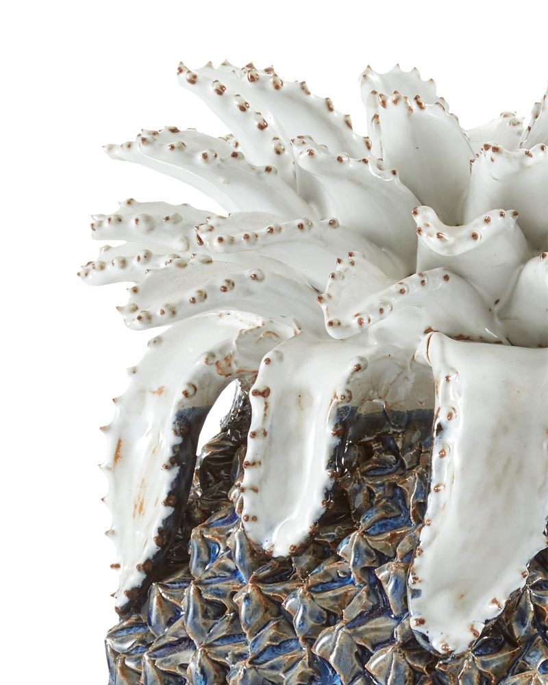 The Waikiki Medium Blue Pineapple decorative accessory is handmade of stoneware by women artisans living at the border of Burma and Thailand. From the Hawaiian shores to 1940s Miami, the pineapple has long been a symbol of hospitality. Place this powdery blue and white ceramic sculpture prominently in a room to make a bold statement.