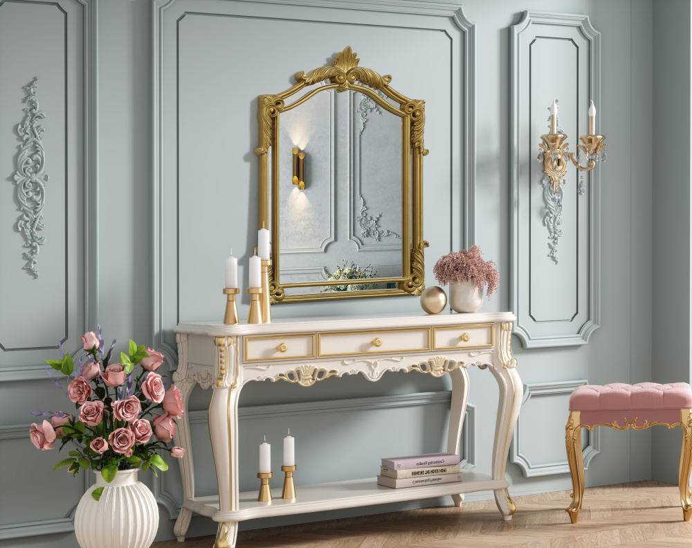 Whether placed in a living room, grand entryway, or above a vintage vanity, this mirror instantly enhances its surroundings with its regal presence.