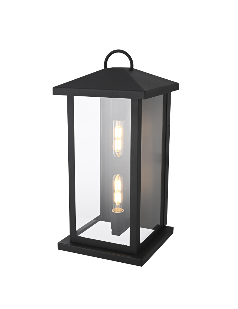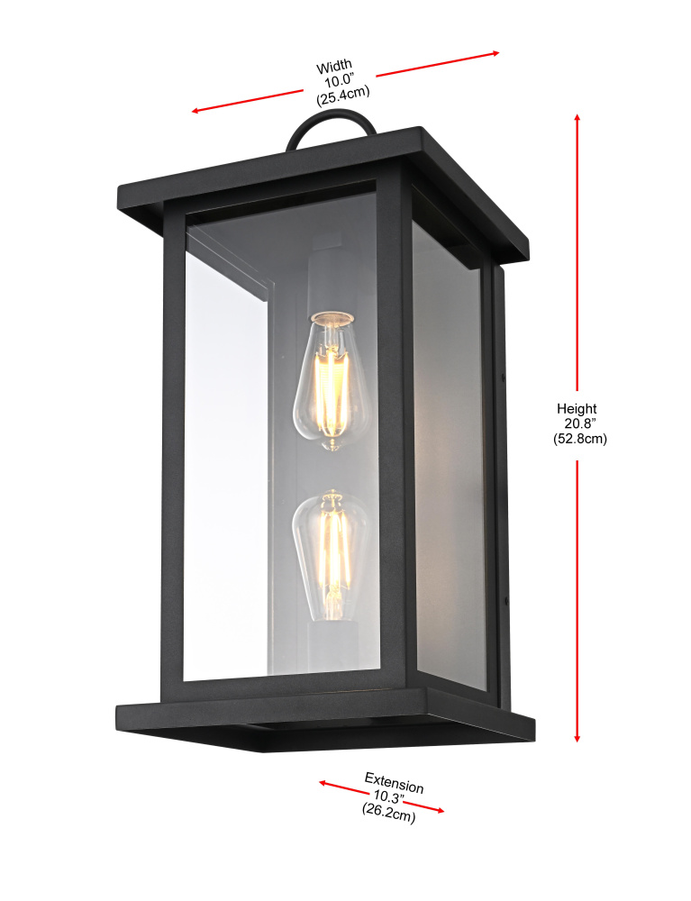 Enhance your outdoor space with the charm and functionality of this modern lantern-style wall light. A strong iron frame, finished in bold matte black, creates a timeless architectural presence, while clear glass panels allow the bulb’s warm glow to shine through unobstructed. A decorative ring detail at the top adds a subtle nod to classic lantern designs, blending tradition with modern refinement. The open-bottom design ensures easy bulb changes and effortless maintenance, making it as practical as it is stylish. Designed with two E26 sockets (bulb not included), this light allows for complete customization in brightness and style. Wet rated for durability, it’s the perfect lighting solution for front porches, patios, and outdoor walkways, offering a radiant, welcoming ambiance year-ro