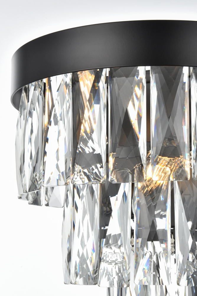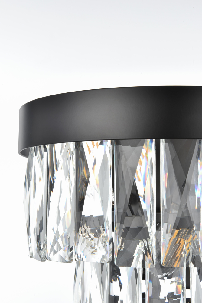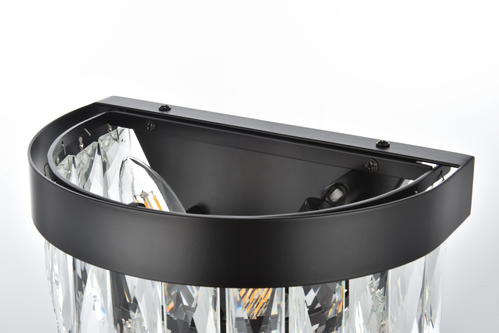 Transform your space with this extraordinary wall sconce that reimagines classical crystal design for contemporary interiors. The masterfully engineered silhouette features three graduating tiers that create a spectacular inverted pyramid, reminiscent of a frozen cascade captured in mid-descent. Each precisely cut rectangular crystal is strategically positioned to maximize light play, creating mesmerizing displays of fractured light throughout your space. The thoughtful construction incorporates 2 light sources distributed throughout the tiers, ensuring both spectacular illumination and enchanting crystal animation. The robust iron framework provides a secure foundation while maintaining visual lightness, allowing the crystals to appear as if floating in space. Available in reflective chrome, sophisticated black, or warm satin gold, this pendant makes an unforgettable statement while maintaining refined restraint. The cascading arrangement creates a sense of movement and flow, while the geometric precision of each crystal adds contemporary edge to the classical form. This is more than a light fixture – it's an architectural feature that transforms your space through its commanding presence and spectacular light performanc