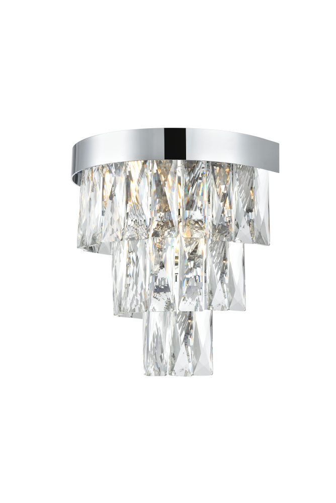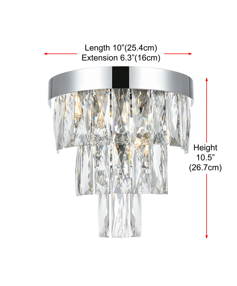 Transform your space with this extraordinary wall sconce that reimagines classical crystal design for contemporary interiors. The masterfully engineered silhouette features three graduating tiers that create a spectacular inverted pyramid, reminiscent of a frozen cascade captured in mid-descent. Each precisely cut rectangular crystal is strategically positioned to maximize light play, creating mesmerizing displays of fractured light throughout your space. The thoughtful construction incorporates 2 light sources distributed throughout the tiers, ensuring both spectacular illumination and enchanting crystal animation. The robust iron framework provides a secure foundation while maintaining visual lightness, allowing the crystals to appear as if floating in space. Available in reflective chrome, sophisticated black, or warm satin gold, this pendant makes an unforgettable statement while maintaining refined restraint. The cascading arrangement creates a sense of movement and flow, while the geometric precision of each crystal adds contemporary edge to the classical form. This is more than a light fixture – it's an architectural feature that transforms your space through its commanding presence and spectacular light performanc