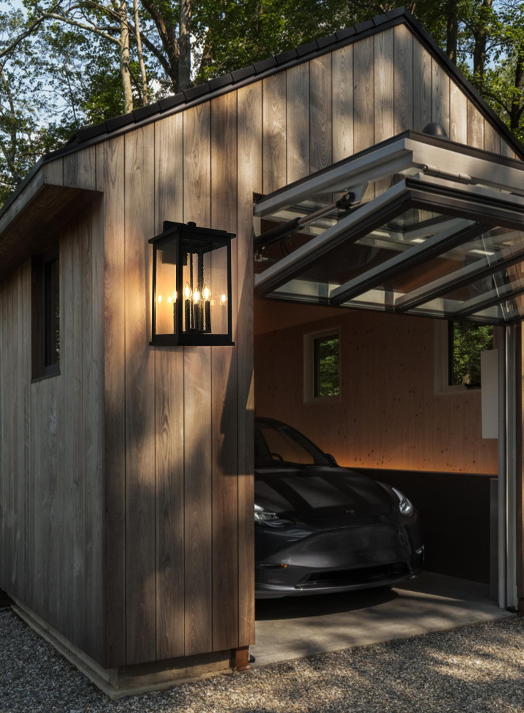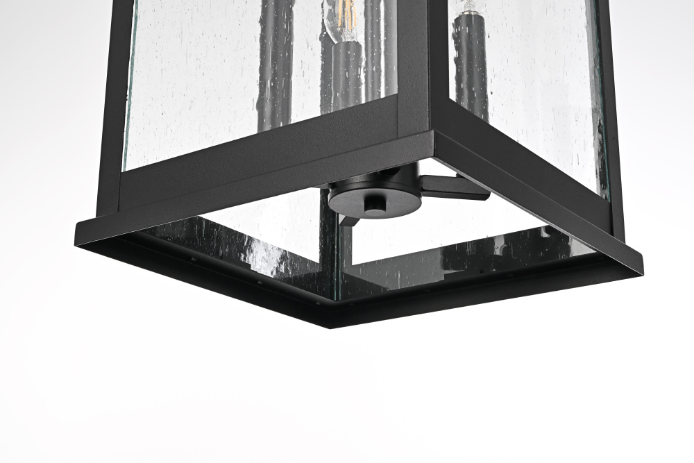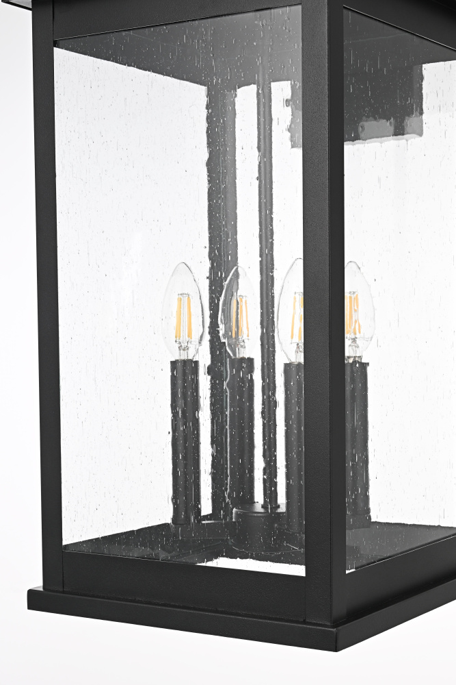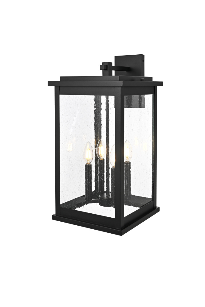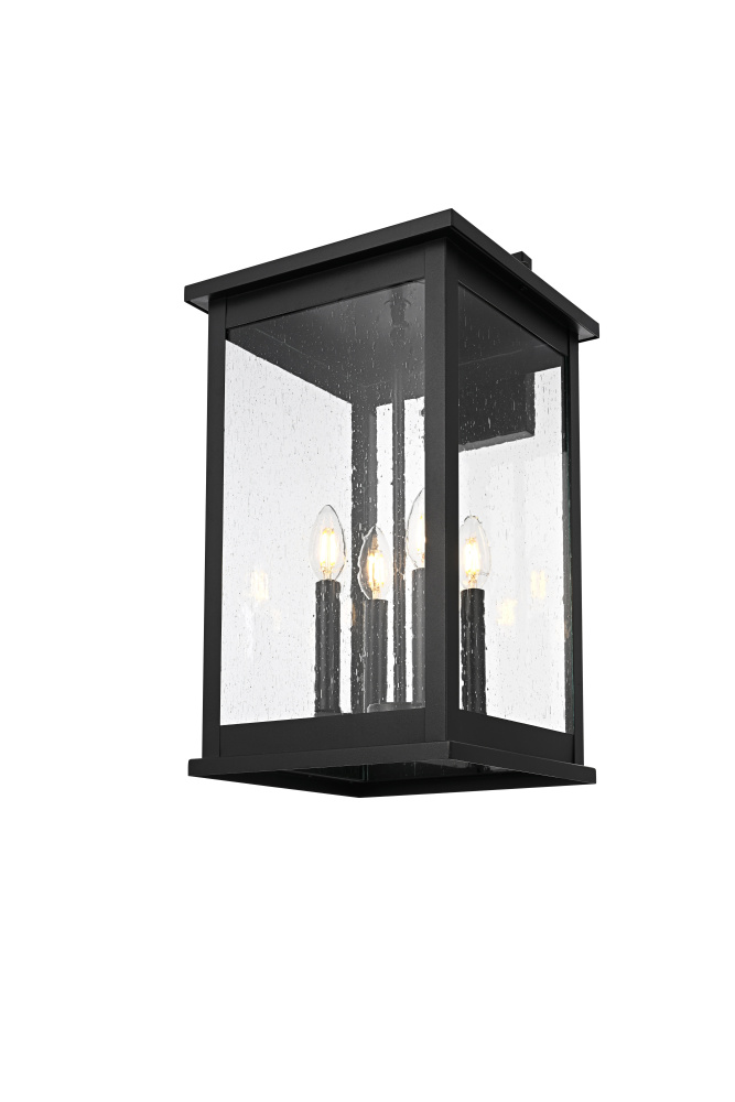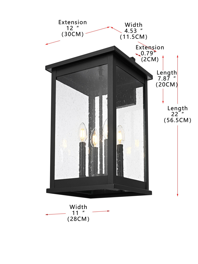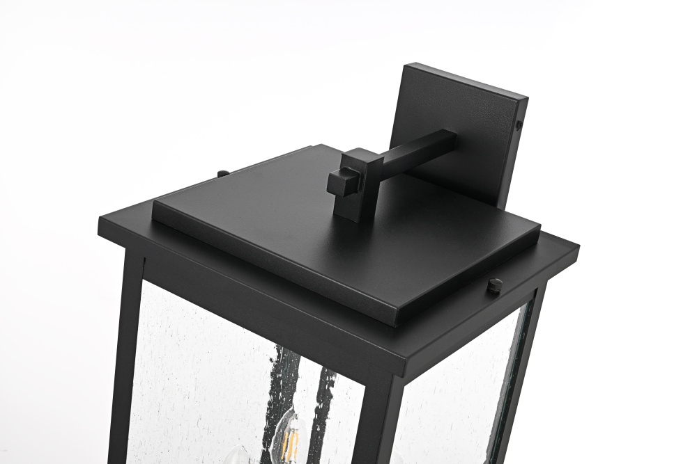 Enhance your outdoor space with this stunning wall sconce, merging a sleek, modern design with timeless craftsmanship. Crafted from durable iron and combined with clear glass panels, this outdoor light exudes an inviting warmth while providing functional illumination. Its crisp rectangular silhouette and clean lines blend beautifully with a variety of architectural styles, adding sophistication to any porch, patio, or entryway. The sconce's four E12 sockets makes it compatible with a range of bulb types, allowing for customizable ambiance. The textured seeded glass adds depth and visual interest, effortlessly scattering light to create a soft glow. Built to withstand the elements, this sconce not only provides aesthetic appeal but also offers reliable outdoor illumination that you can count on for years to come.