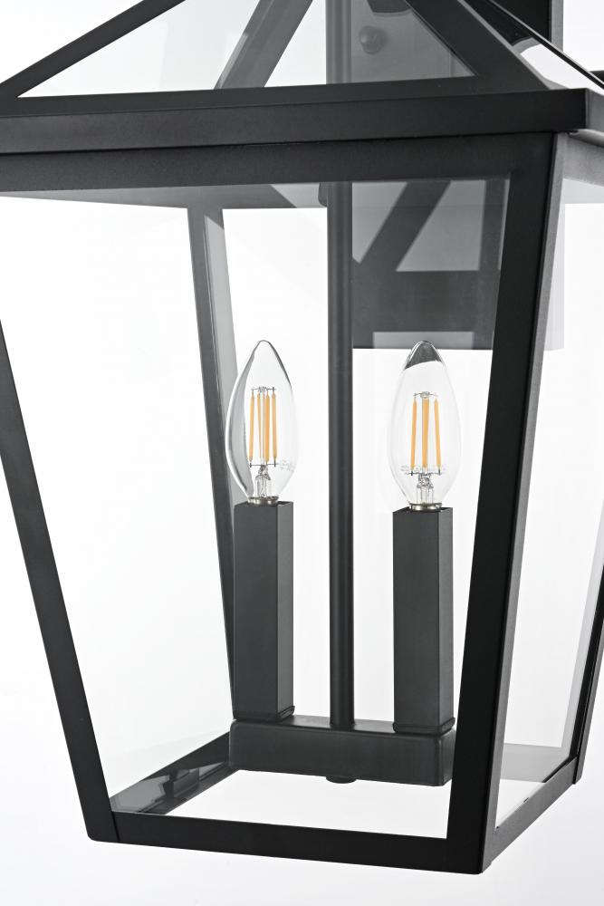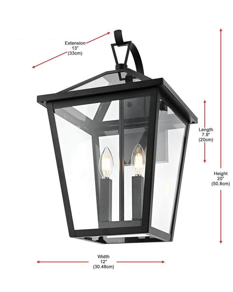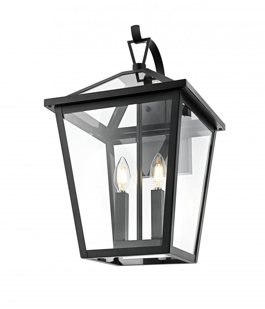 This outdoor wall sconce is a beautiful embodiment of modern and classic design that perfectly complements any exterior home setting. Constructed from sturdy iron and clear glass, the sconce combines sharp architectural lines with a timeless lantern style, resulting in a statement fixture that enhances curb appeal. The angular matte black frame, topped by a stylish triangular loop, embraces an open, trapezoid-shaped structure with clear glass panels that reveal two E12 candelabra sockets. These sockets provide the ideal opportunity to incorporate flame-shaped bulbs for a warm, welcoming ambiance. The open bottom design not only adds a touch of convenience for bulb replacement but also emphasizes the light's natural downward glow, making this sconce both practical and visually captivating. This piece is perfect for flanking a front door, lining a pathway, or accentuating any outdoor living area.