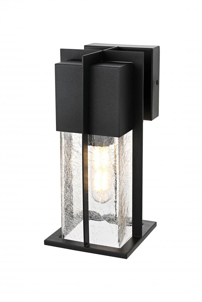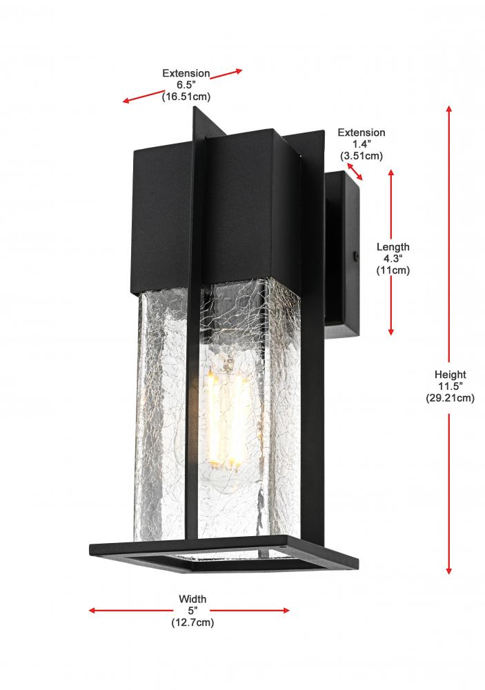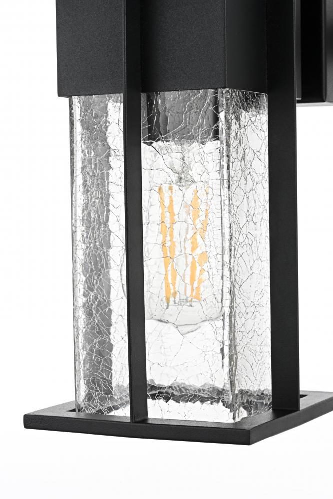 Enhance the ambiance of your outdoor space with this distinctive wall sconce, crafted from durable iron and encased in clear, crackled glass panels. Its bold, geometric frame seamlessly combines modern lines with industrial touches, making it the perfect accent for any entryway, patio, or garden. The cracked glass effect adds visual intrigue and soft diffusion of light, creating a welcoming atmosphere. Featuring an E26 socket, it provides versatility for any standard bulb, while the sturdy construction ensures longevity against weather elements. This wall sconce not only lights up the night but also serves as an architectural statement, perfect for both modern and transitional exterior designs.