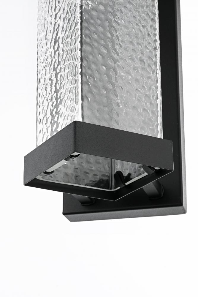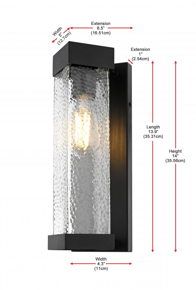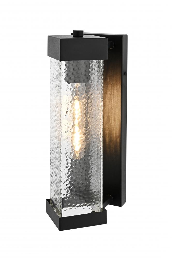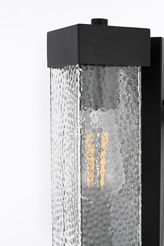 Bring a refined touch to your exterior spaces with this stunning outdoor wall sconce. The design features a black iron frame with a tall rectangular silhouette, providing a timeless and bold statement. The textured, rippled glass panel emits a diffused and inviting light, creating a beautiful ambient glow. The E26 socket offers compatibility with a range of light bulb types, including energy-efficient LED options, while the rugged iron construction ensures durability against the elements. The sconce’s structured aesthetic, topped and bottomed with iron frames, embodies both strength and sophistication, making it ideal for doorways, patios, or walkways.