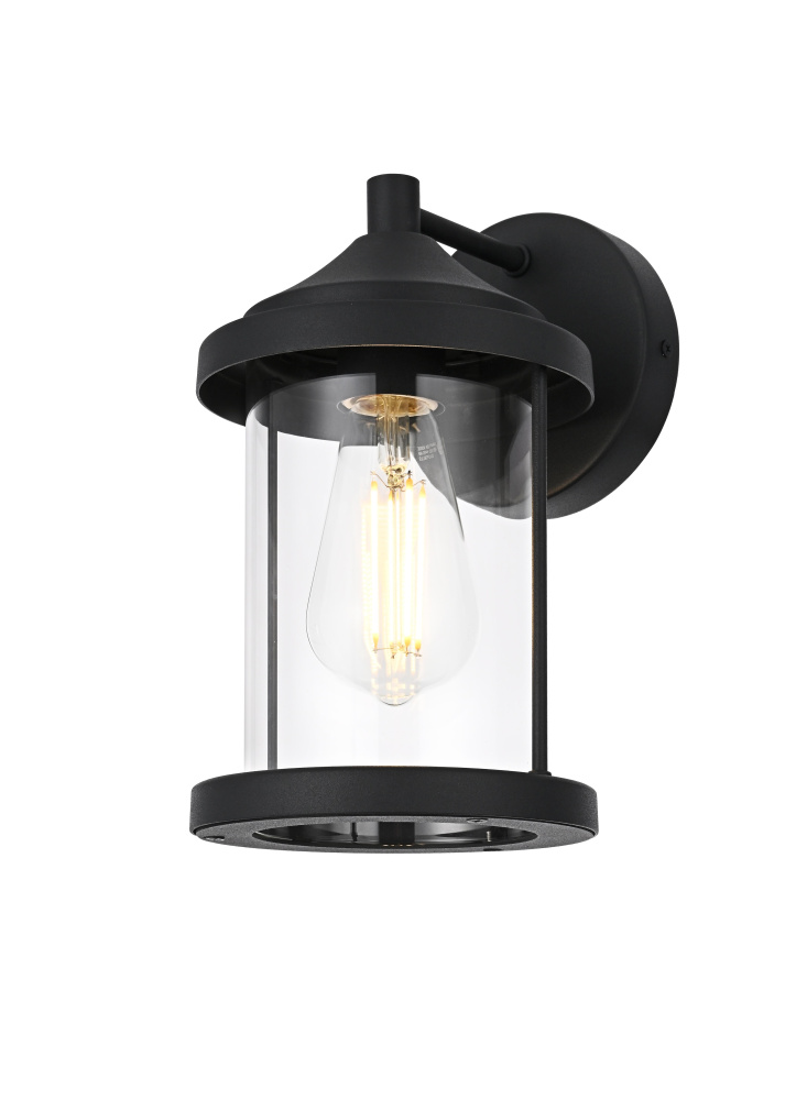 Add a touch of classic charm to your outdoor spaces with this timeless lantern-style wall light. Crafted from durable iron with a sleek circular backplate, this fixture combines traditional aesthetics with modern functionality. The clear glass cylinder provides unobstructed light, allowing the bulb to shine brilliantly, while the thick top and bottom trims frame the design with balance and structure. The open-bottom design not only enhances its aesthetic appeal but also ensures easy bulb replacement. Wet rated for outdoor durability, this light is perfect for porches, patios, and entryways. Featuring an E26 socket, it allows you to customize the look with your choice of bulb (not included). Bring style and practicality to your home’s exterior with this refined and versatile lighting fixtur