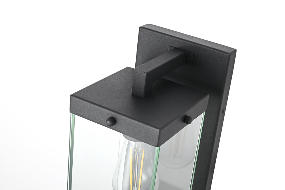 Elevate your outdoor lighting with this refined modern box lantern, designed for both style and durability. Crafted from high-quality iron with a sleek matte black finish, this fixture features a clean-lined rectangular frame accented by clear glass panels for maximum illumination. The enclosed bottom, secured with screws, enhances the structure’s durability while protecting the bulb from direct exposure. A floating arm mount adds a touch of architectural elegance, making this fixture an eye-catching addition to any exterior. Designed with an E26 socket (bulb not included), it offers versatility in lighting choices to suit your space. Wet rated for outdoor resilience, this fixture is perfect for patios, entryways, and exterior walls, blending contemporary aesthetics with functional brillianc