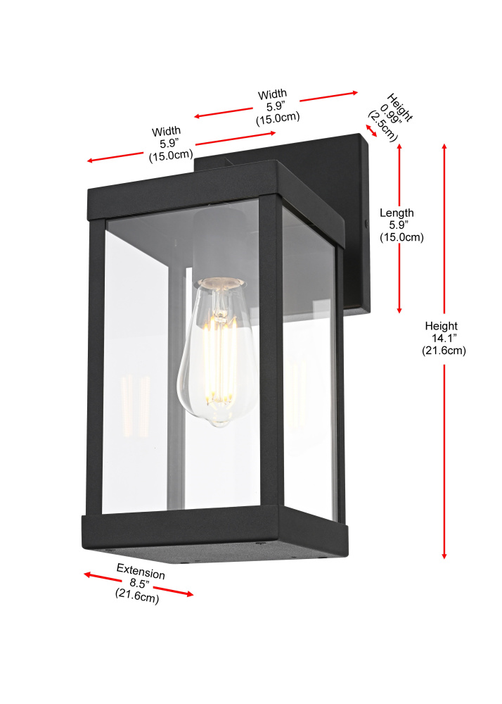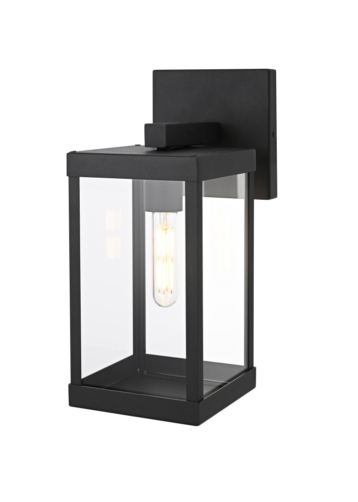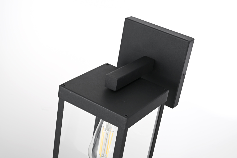 Bring definition and clarity to outdoor spaces with a modern lantern that makes a statement. A crisp rectangular frame, crafted from durable iron with a matte black finish, offers a bold contrast to the clear glass panels that surround the bulb. The structured design features an enclosed bottom for a clean and finished look, while the suspended bulb effect creates a striking focal point. A minimalist backplate and streamlined mounting arm maintain the sleek aesthetic, making this wet-rated wall light perfect for patios, entryways, and garages. Designed with an E26 socket (bulb not included), this lantern provides customizable lighting to enhance any exterior with precision and style.