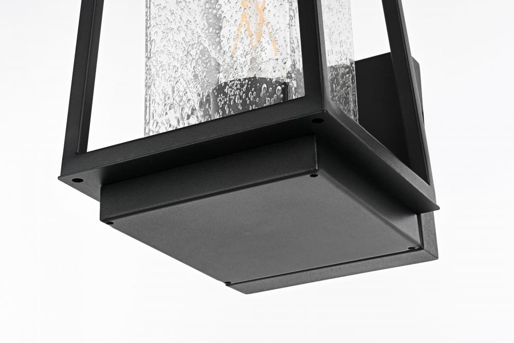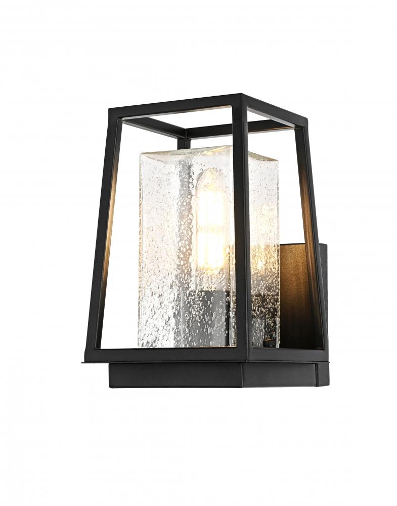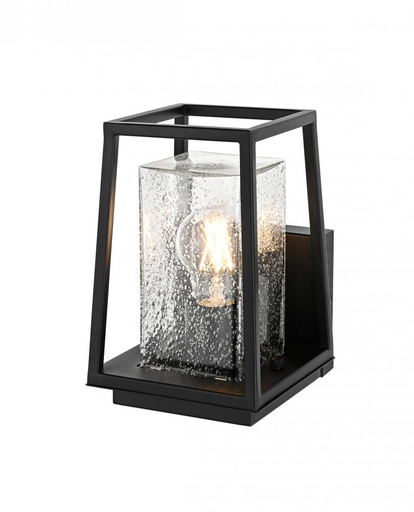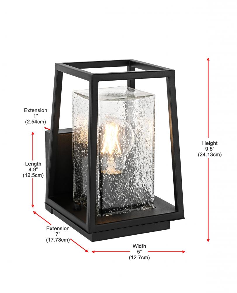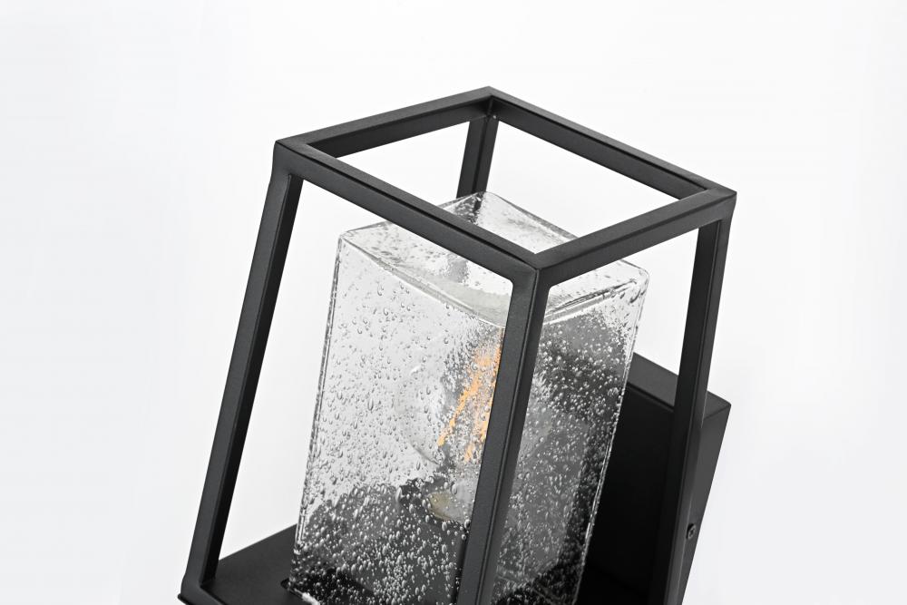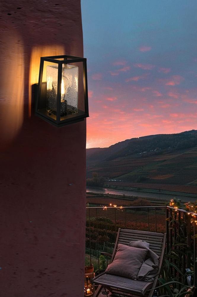 Transform your outdoor space with this stunning outdoor wall sconce that seamlessly combines modern design with timeless craftsmanship. Crafted from high-quality iron and paired with clear, seedy glass, this sconce provides a warm and inviting glow perfect for creating a cozy and sophisticated ambiance. The clean, sharp lines and trapezoidal open design are accentuated by the E26 socket, which accommodates various decorative bulbs to elevate its contemporary flair. Ideal for patios, porches, or entryways, this sconce brings durability and beauty to any exterior wall, blending style and function effortlessly.